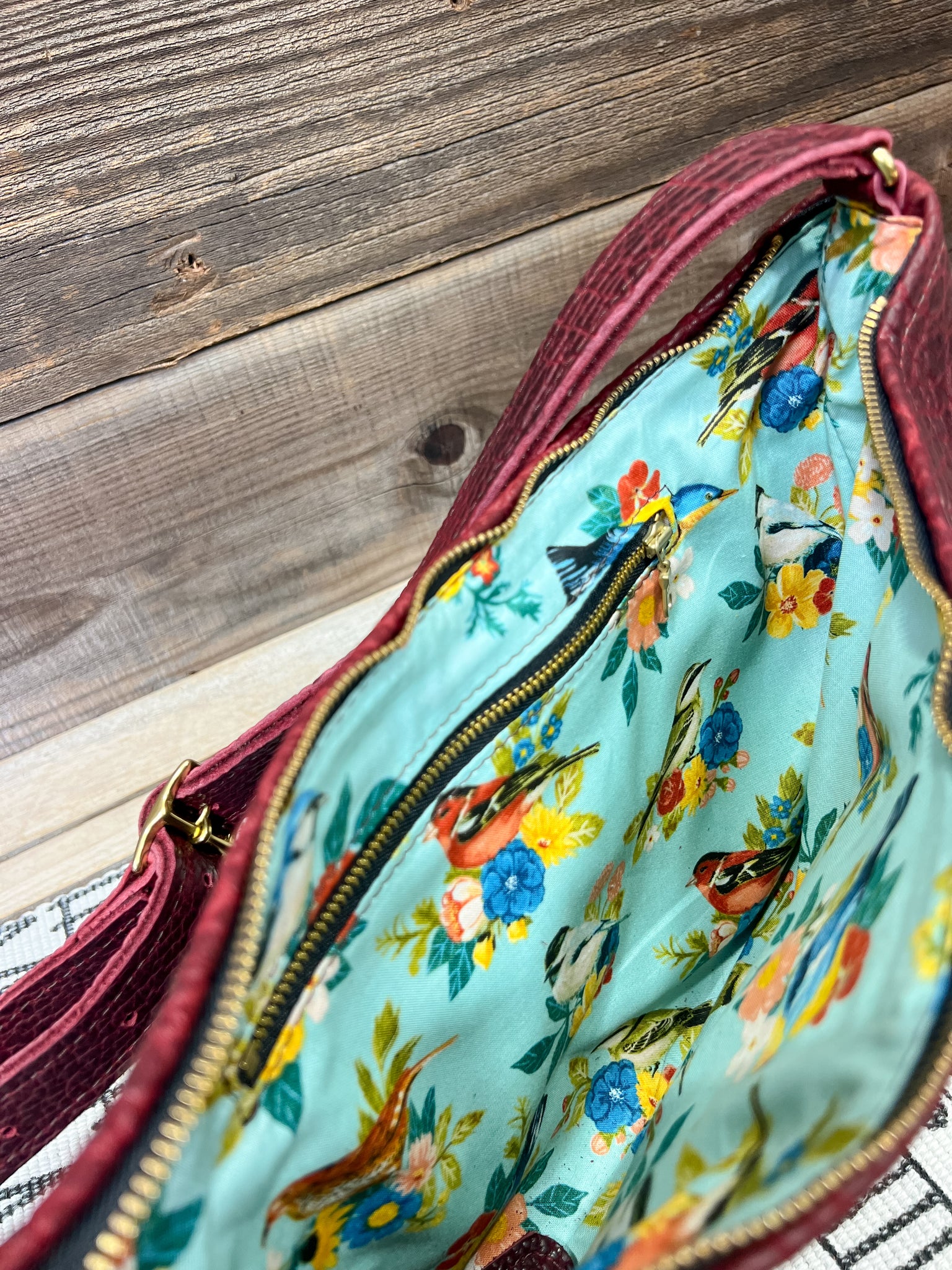 The leather is in our Deep Wild Cherry Bison and lined in our Singing Songbirds fabric.