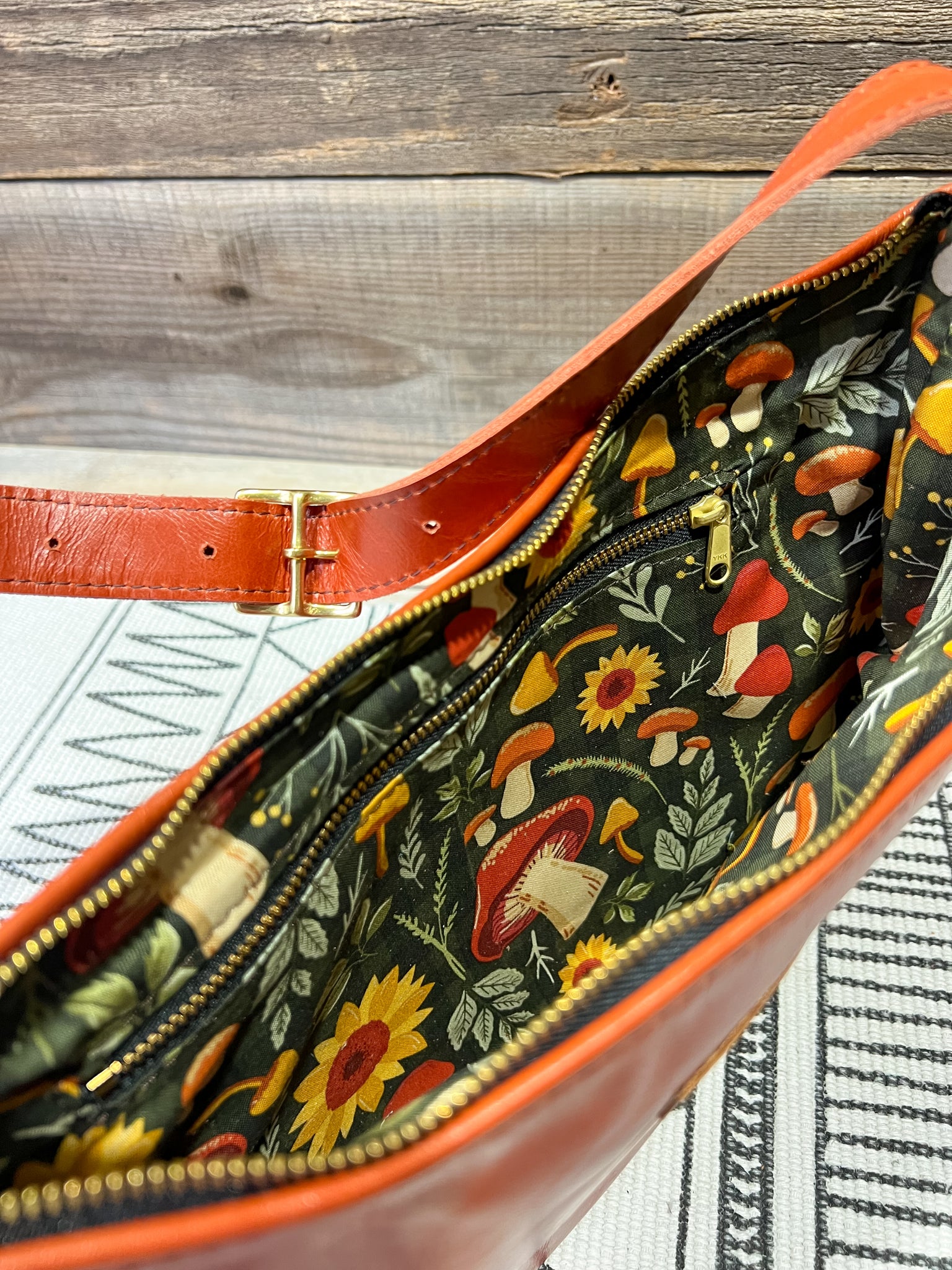 This is in our Auburn Burnt Orange and lined with our Warm Forest Shrooms fabric.