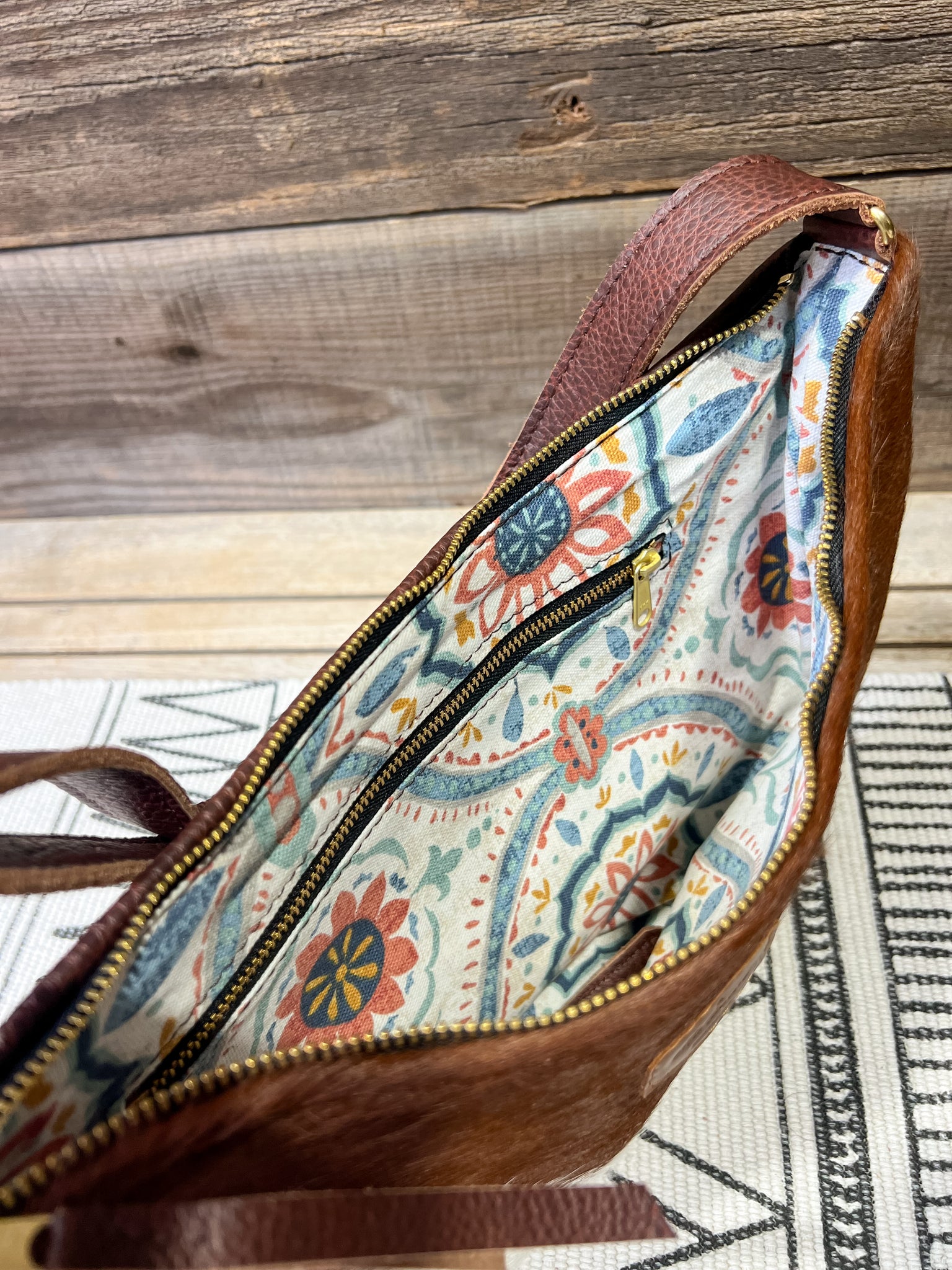 This is in our Dark Brown Hair on Hide and lined with our Bright Blue Paisleys fabric.
