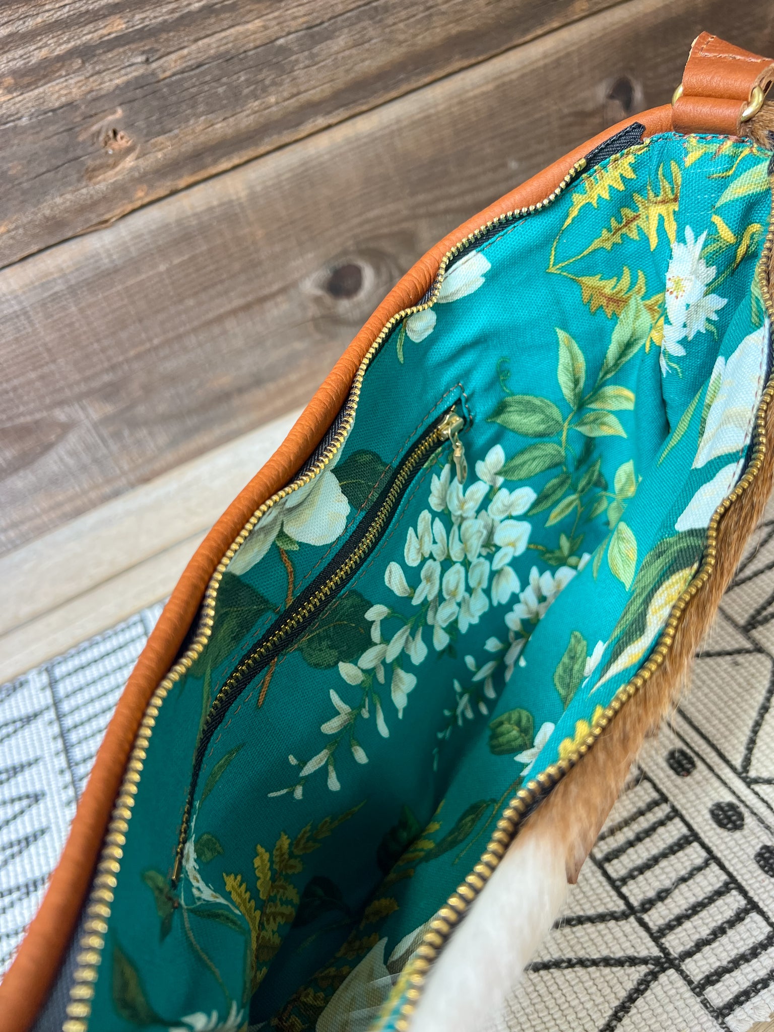 The leather is in our Medium Brown Hair on Hide and lined in our Magonlia Garden fabric.