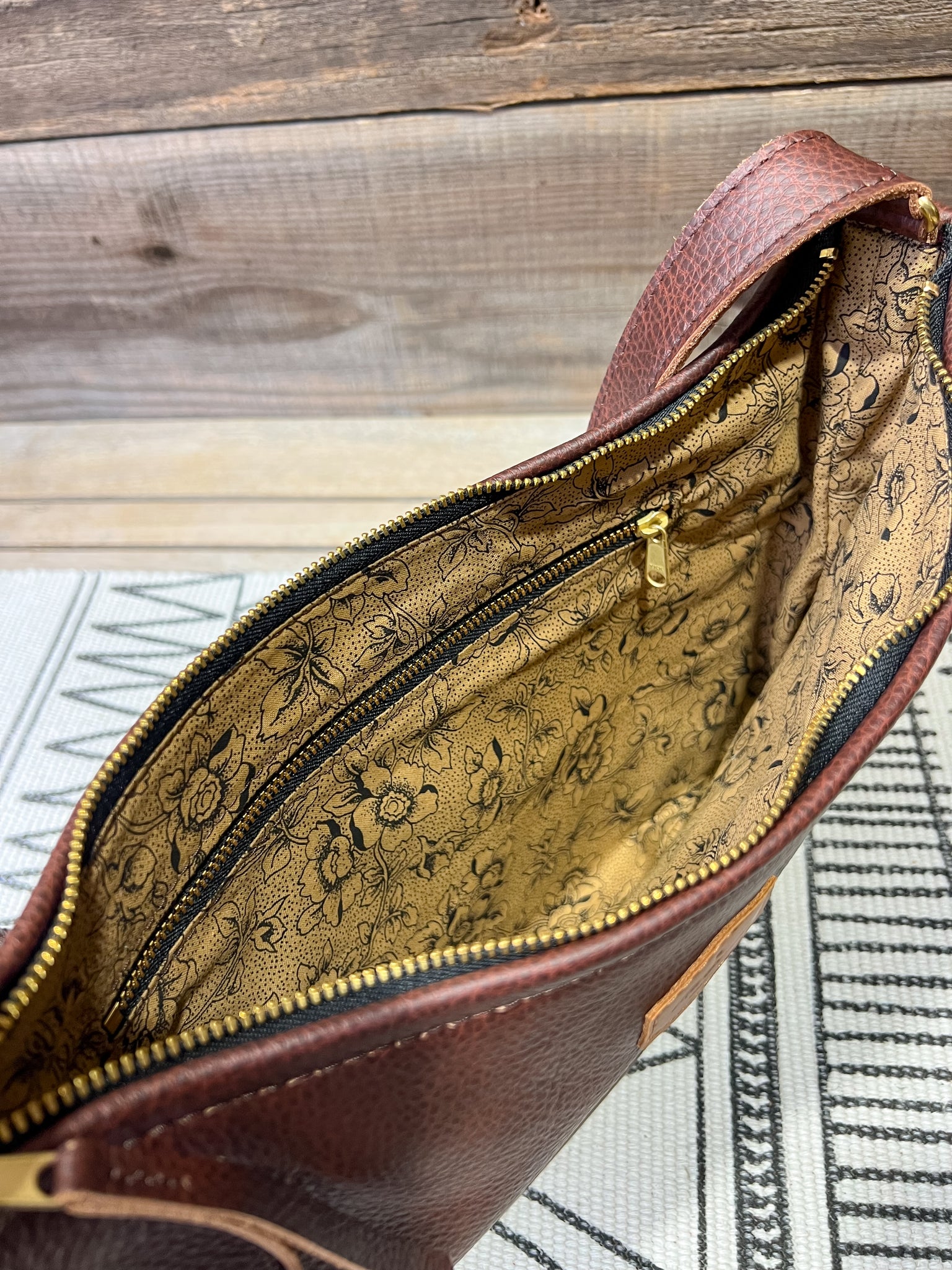 This is in our Espresso Brown and lined with our Handdrawn Floral fabric.