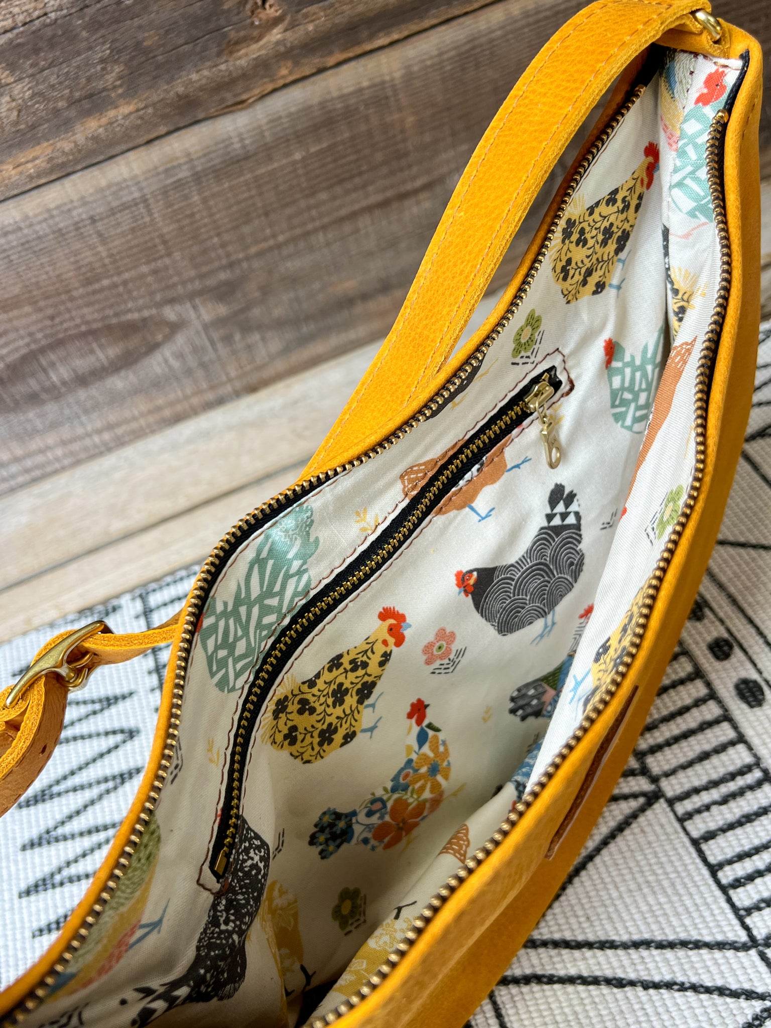 The leather is in our Golden Mustard Bullhide and lined in our Colorful Quilted Chickens fabric.