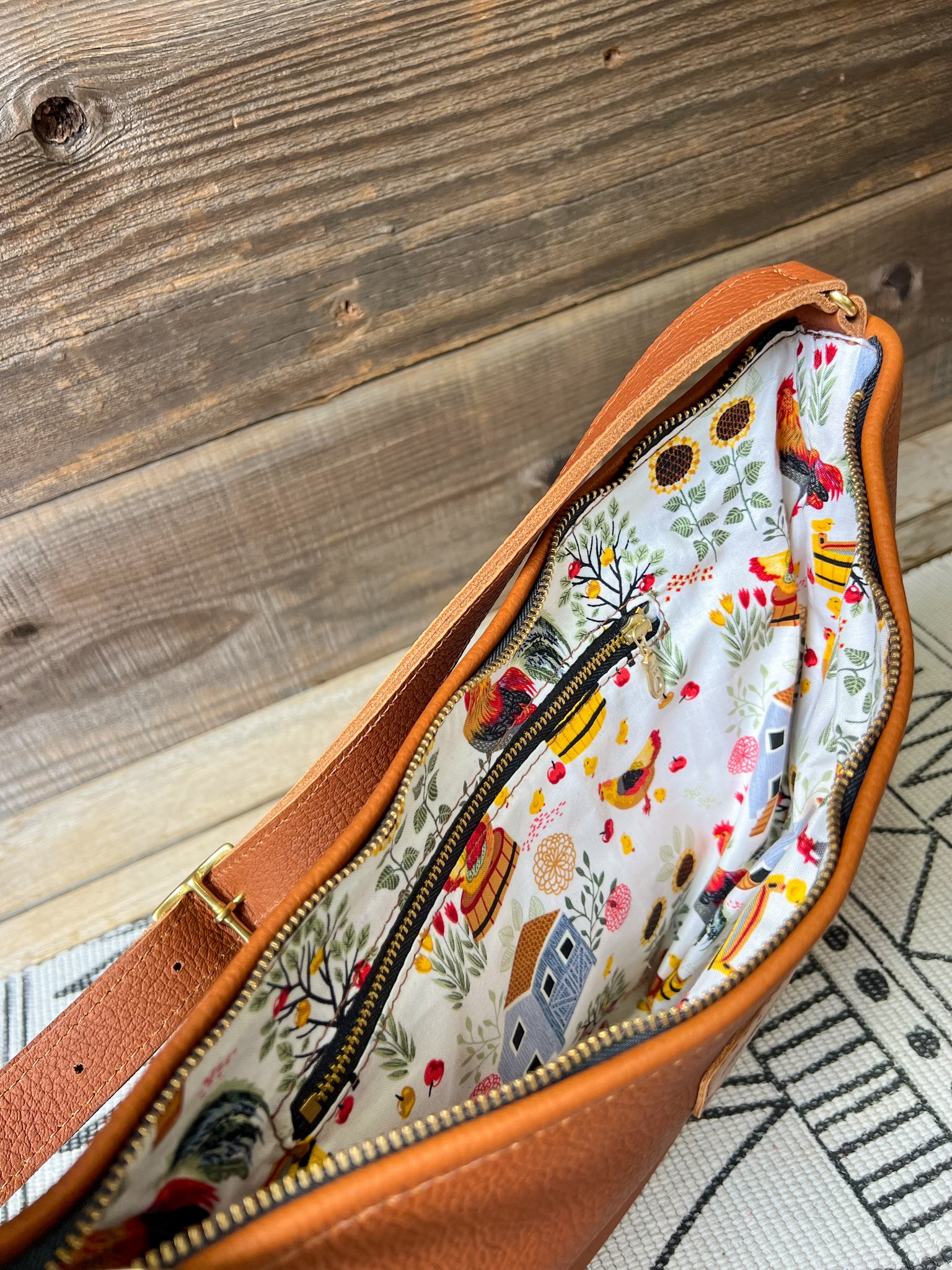 The leather is in our Praline Latte and lined in our Clucking Chickens on the Farm fabric.
