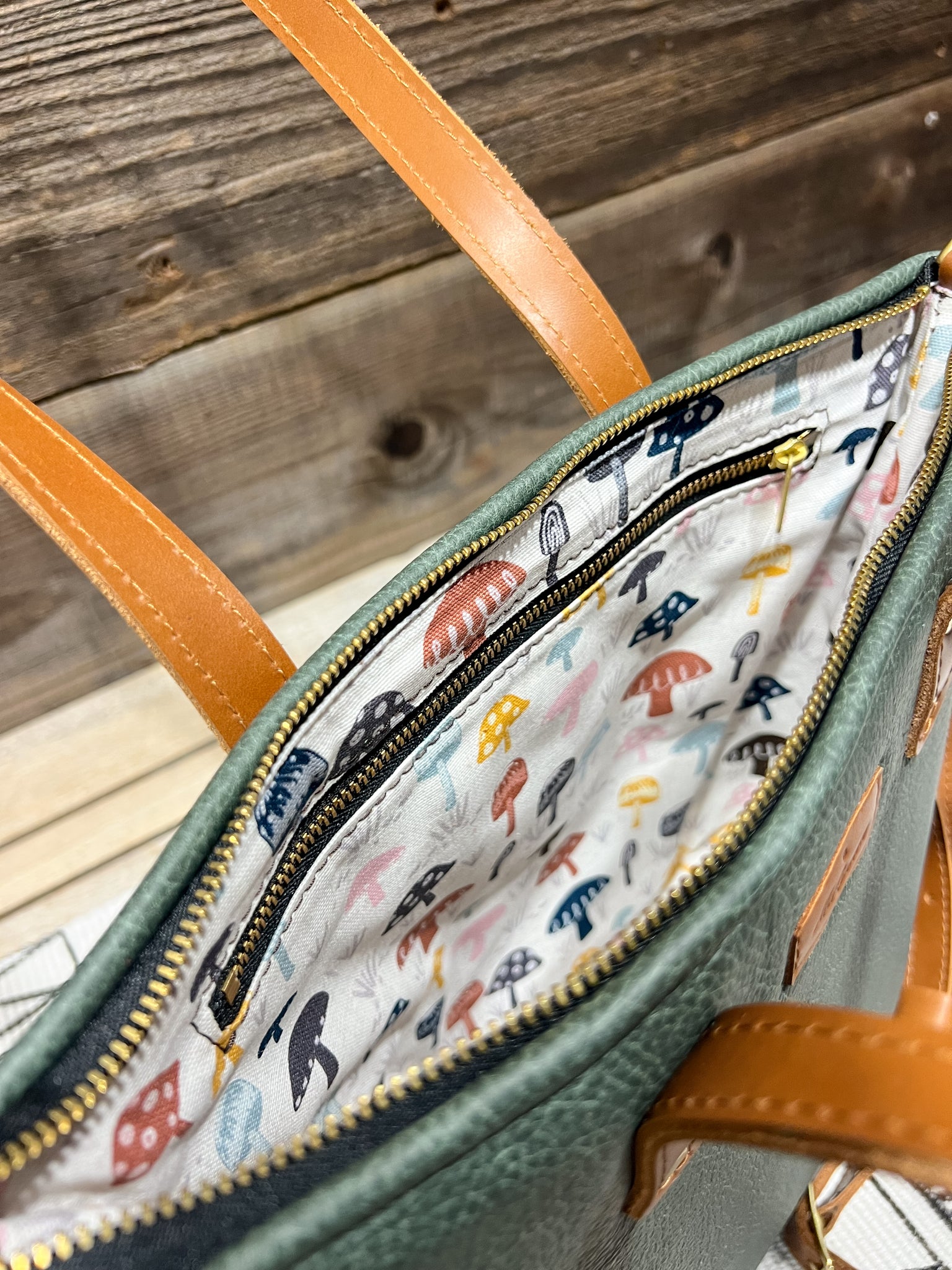The leather is in our Spanish Moss Green and lined in our Colorful Mushroom Medley fabric.