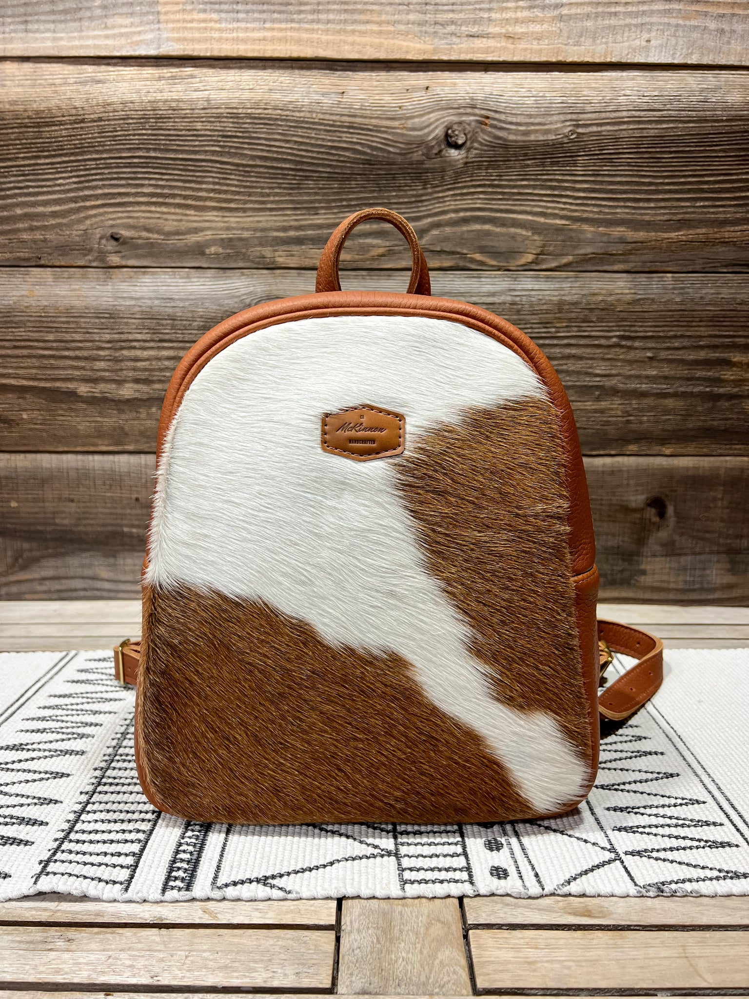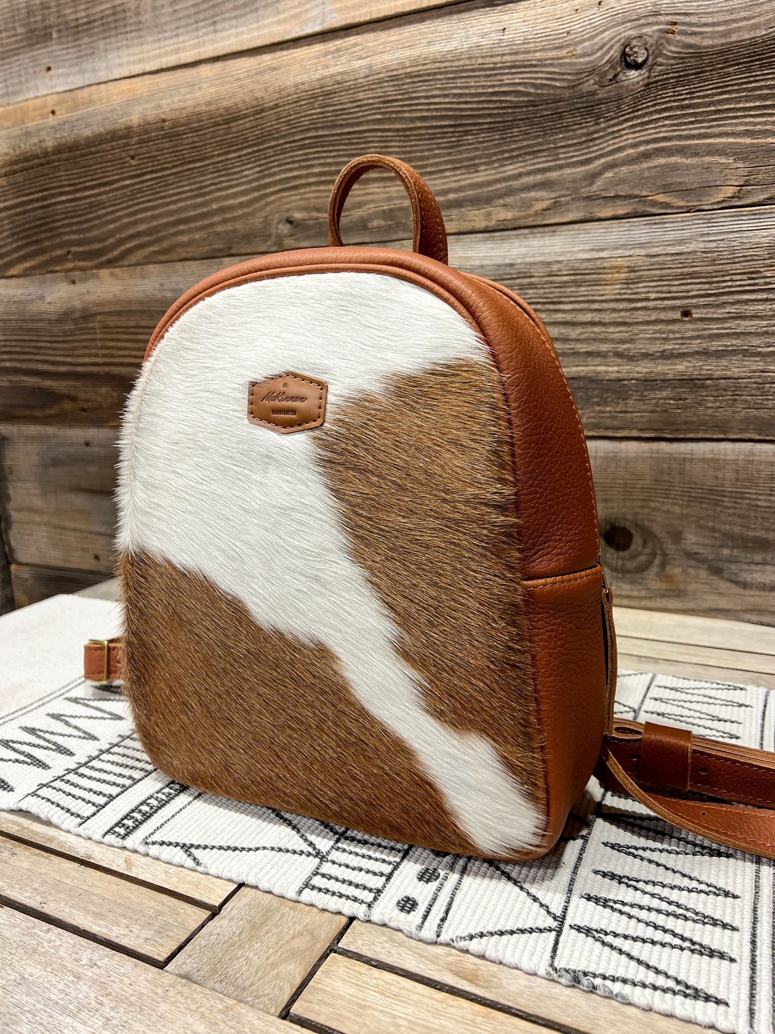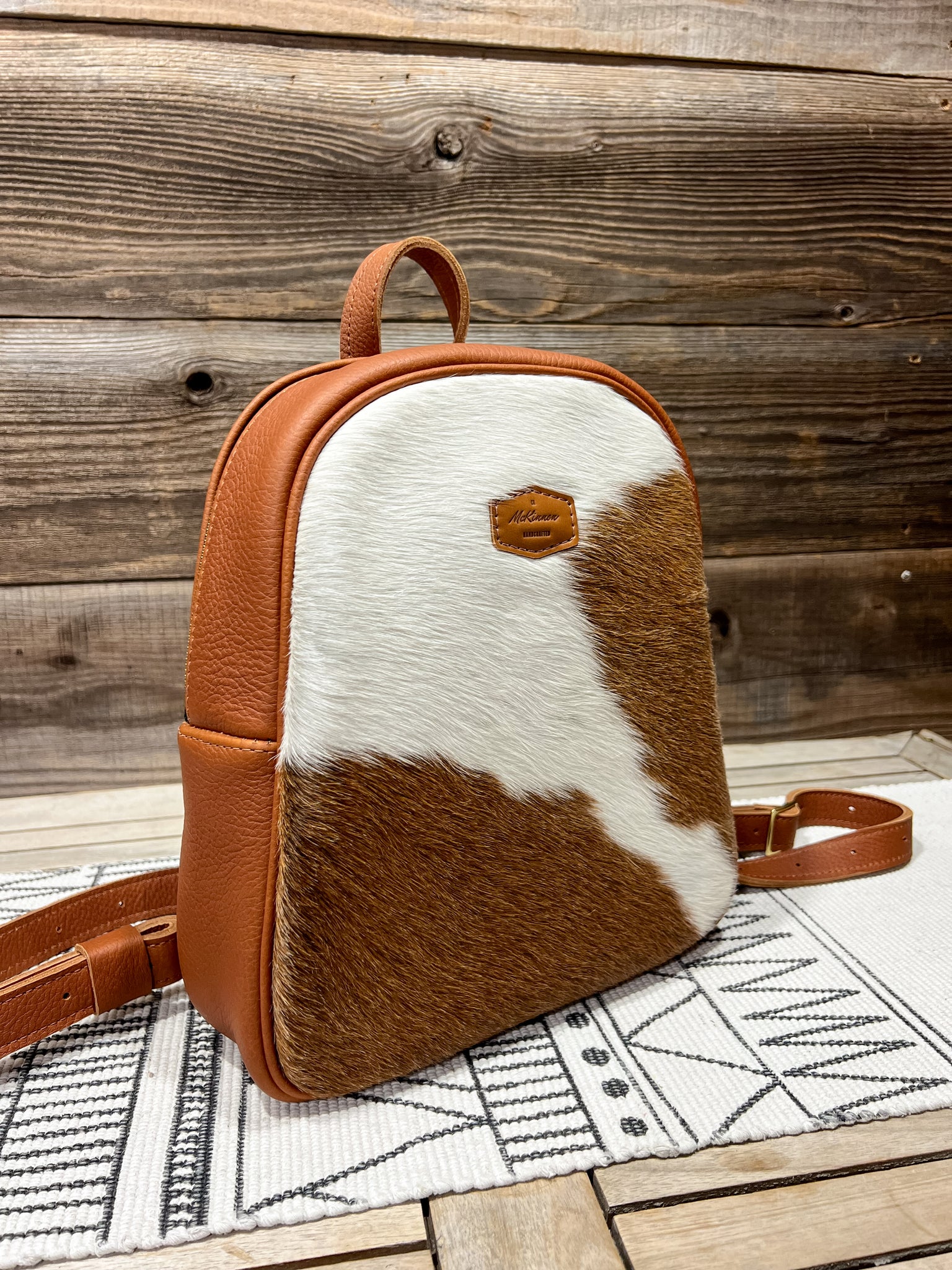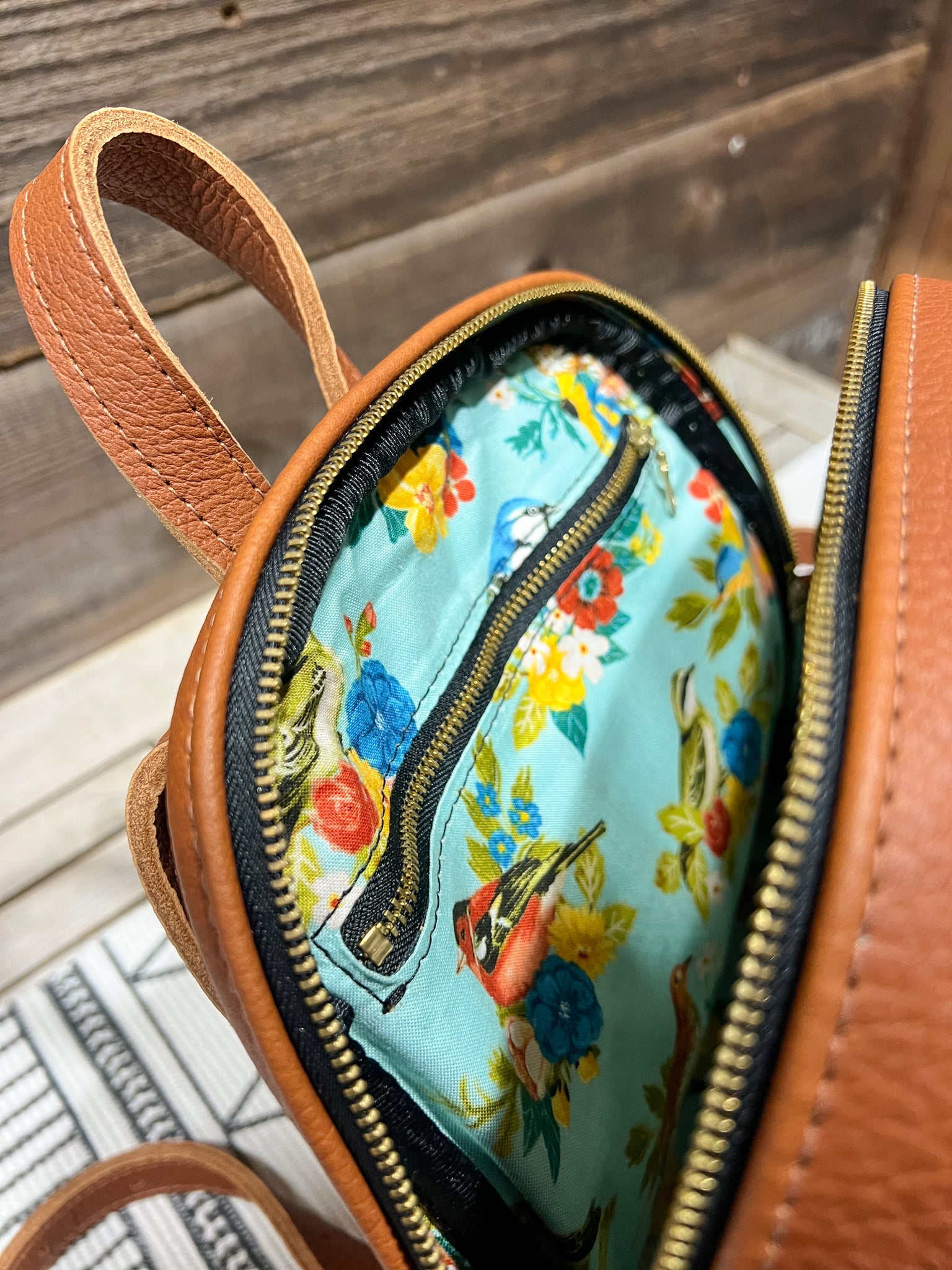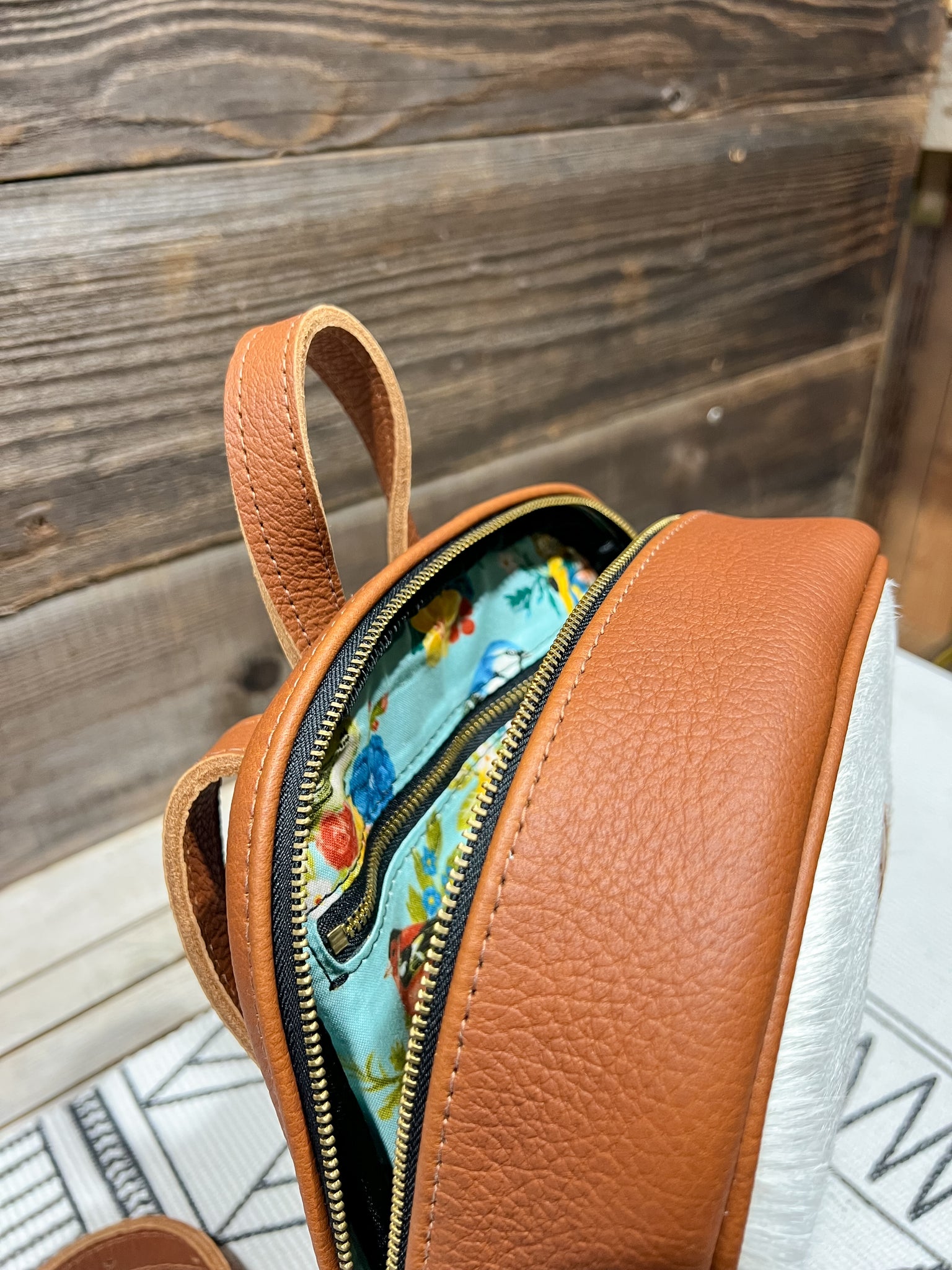The leather is in our Hair on Hide Brown & White and lined in our Singing Songbirds fabric.