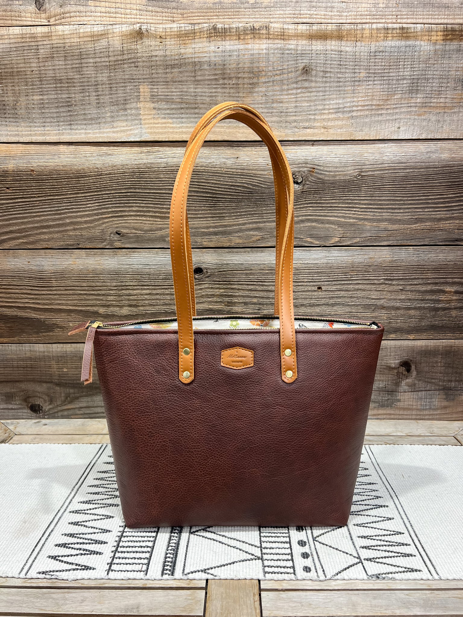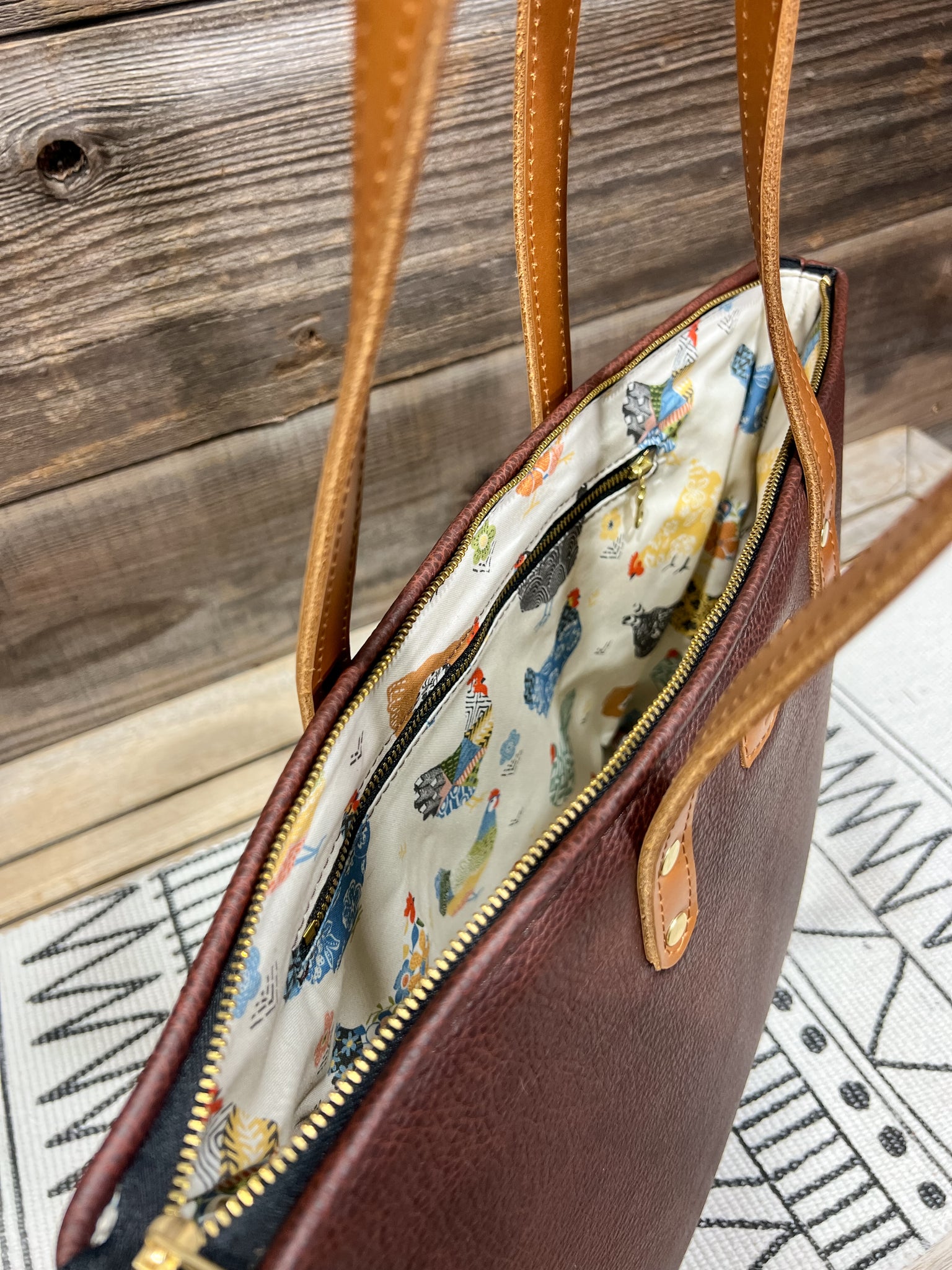The leather is in our Dark Espresso Brown and lined in our Quilted, Colorful Chickens fabric.