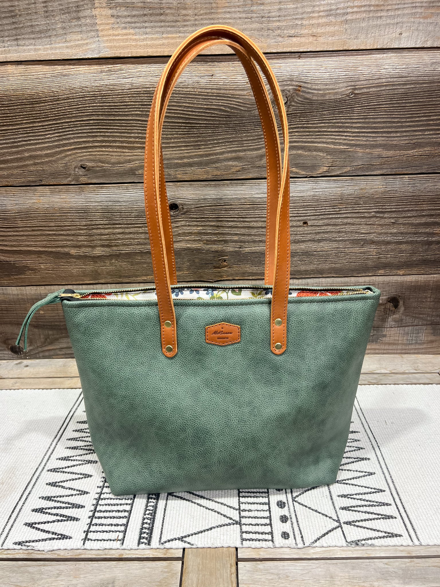 The leather is in our Spanish Moss Green and lined in our Boho Inspired Wildflowers fabric.