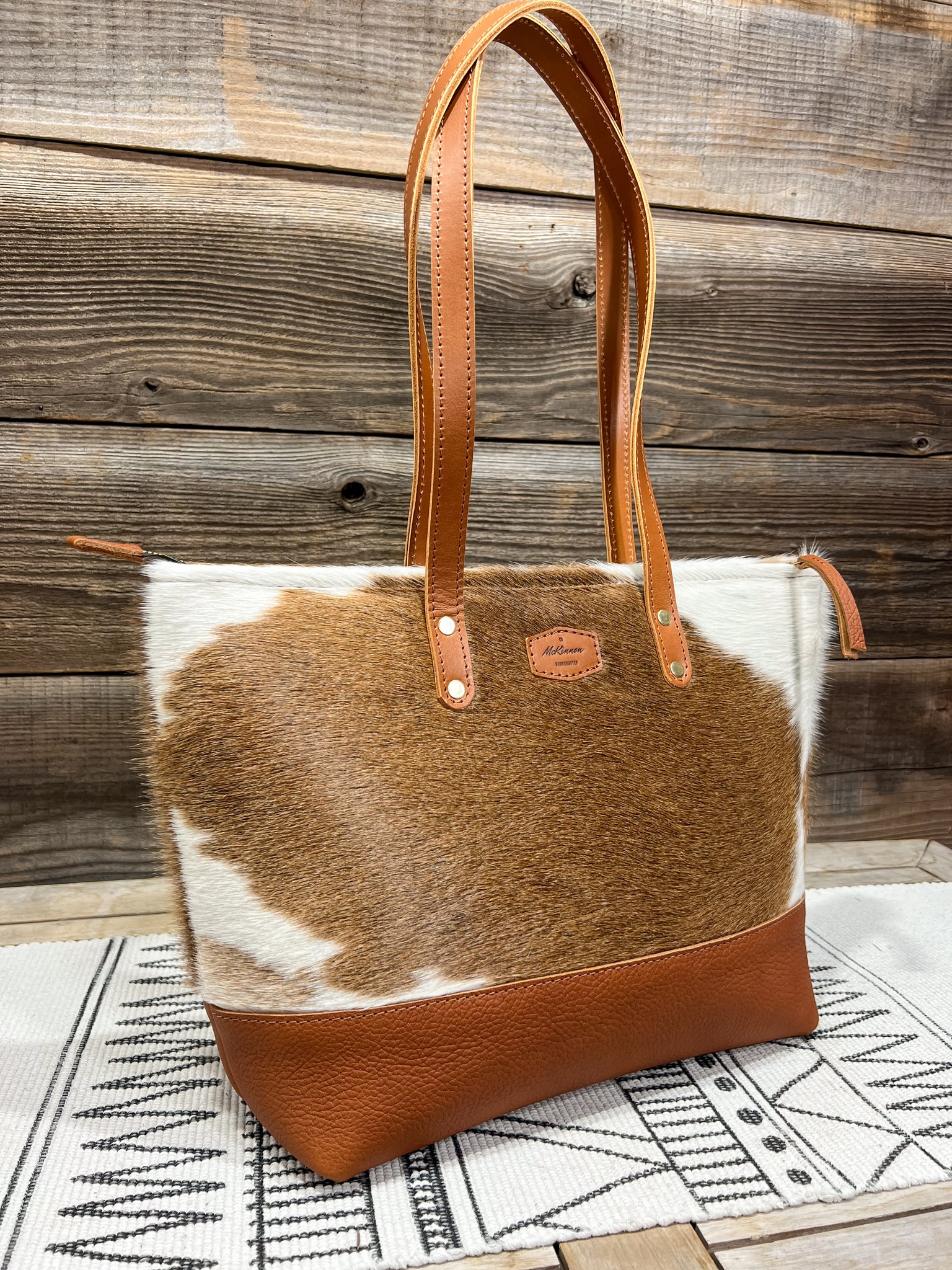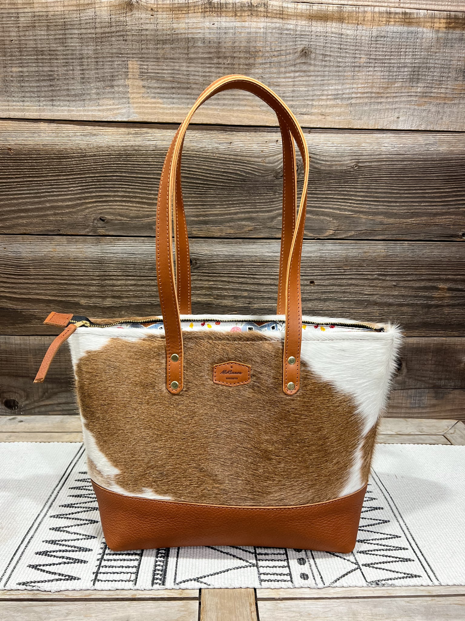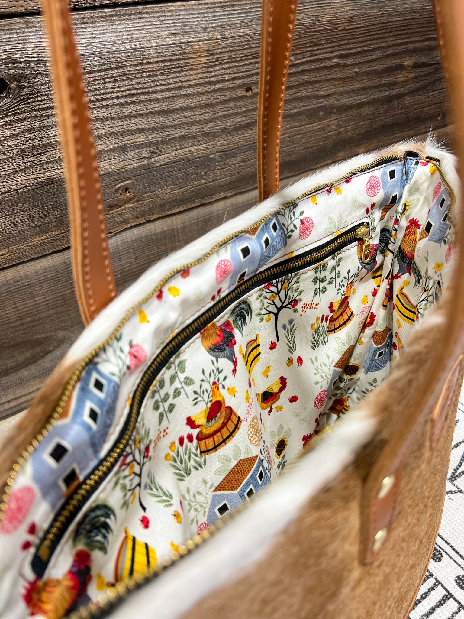 The leather is in our Hair on Hide Tan Brown and lined in our Beekeepers At Work fabric.