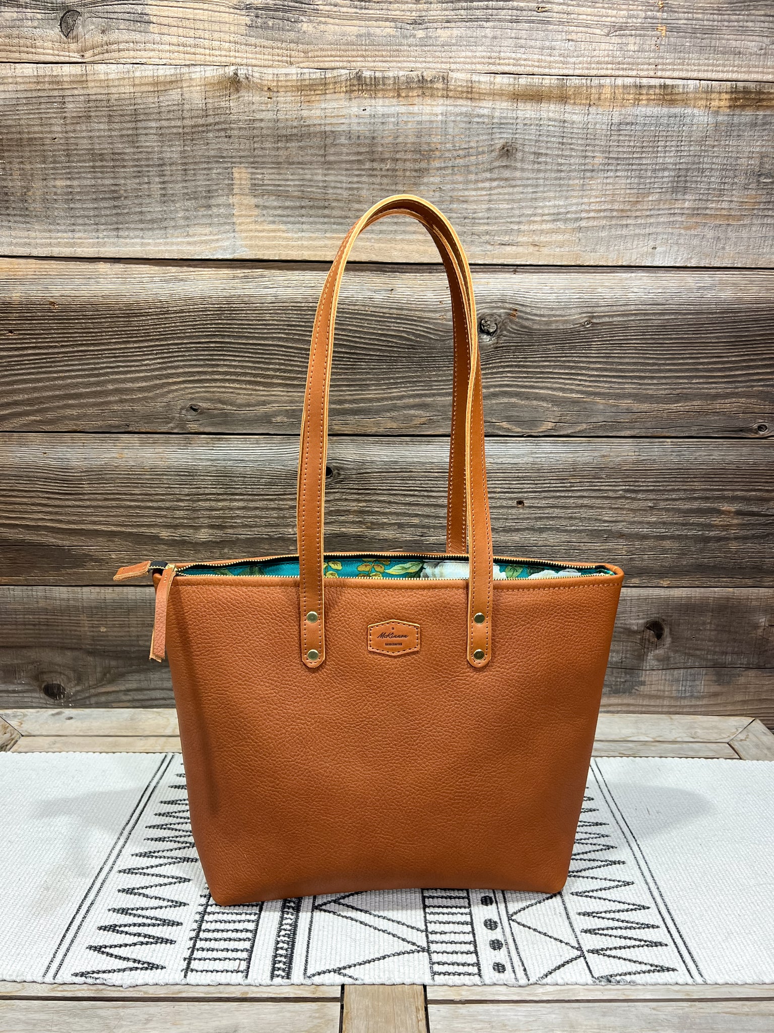 The leather is in our Praline Latte and lined in our Camelia Garden fabric.