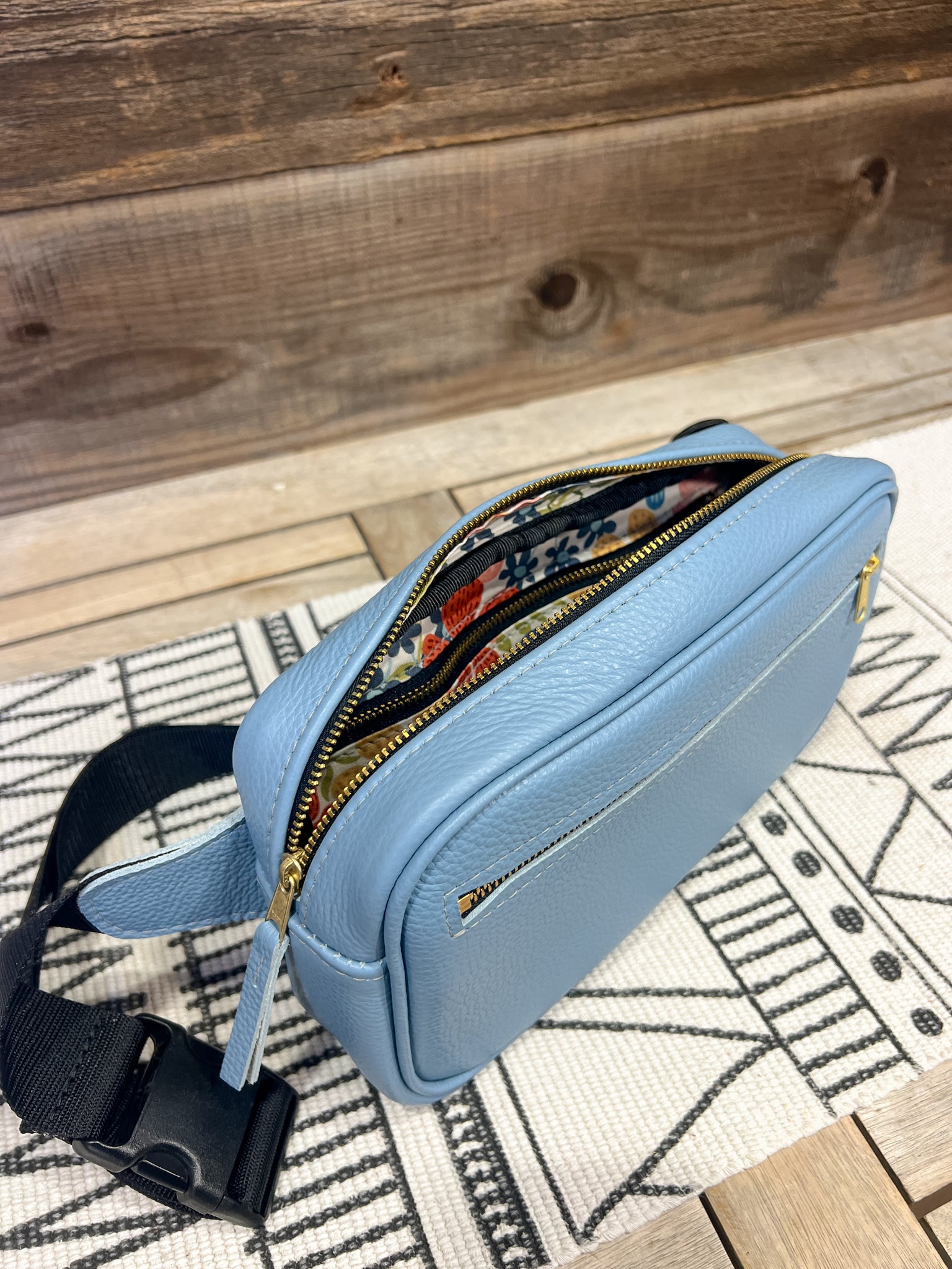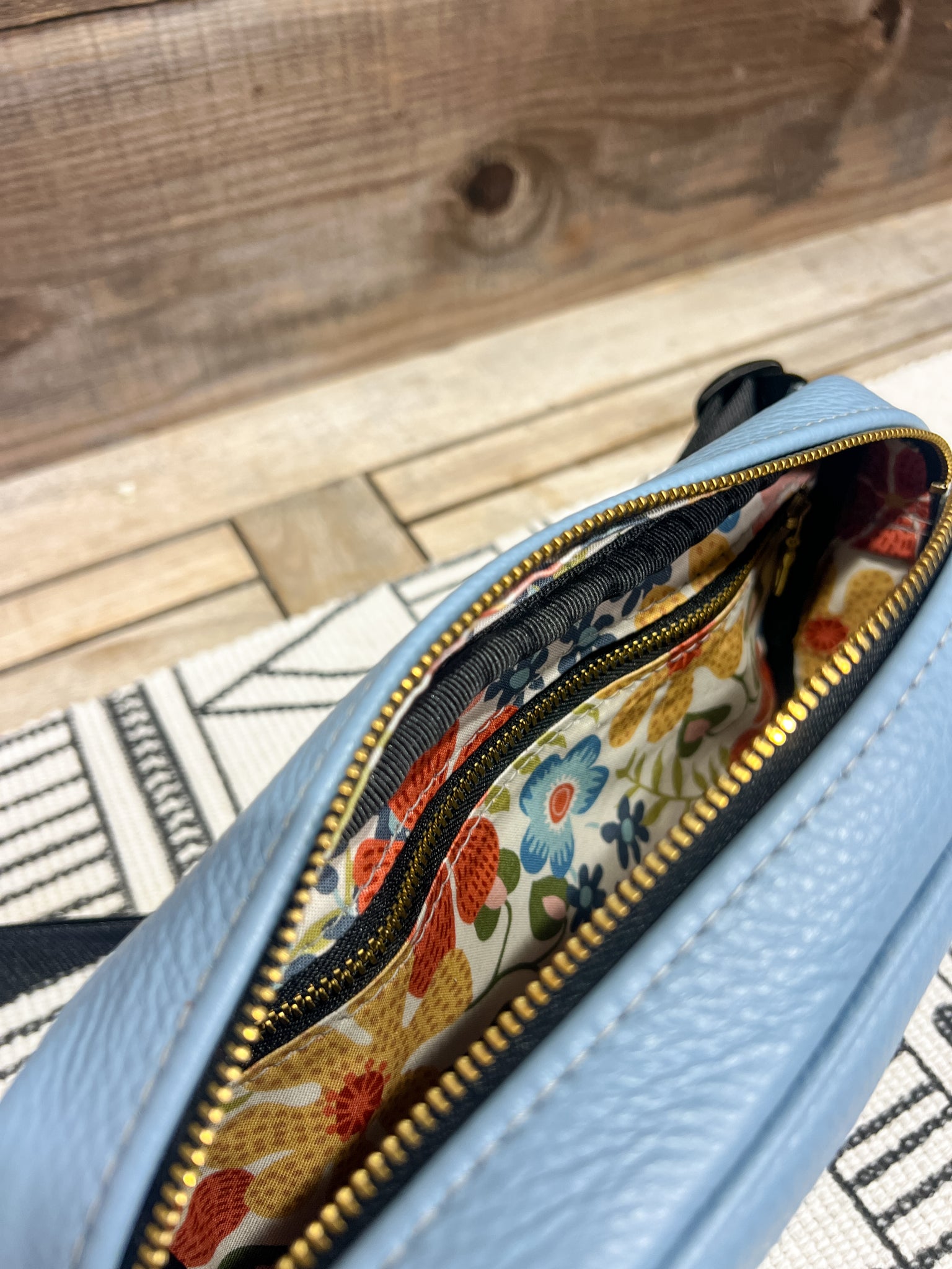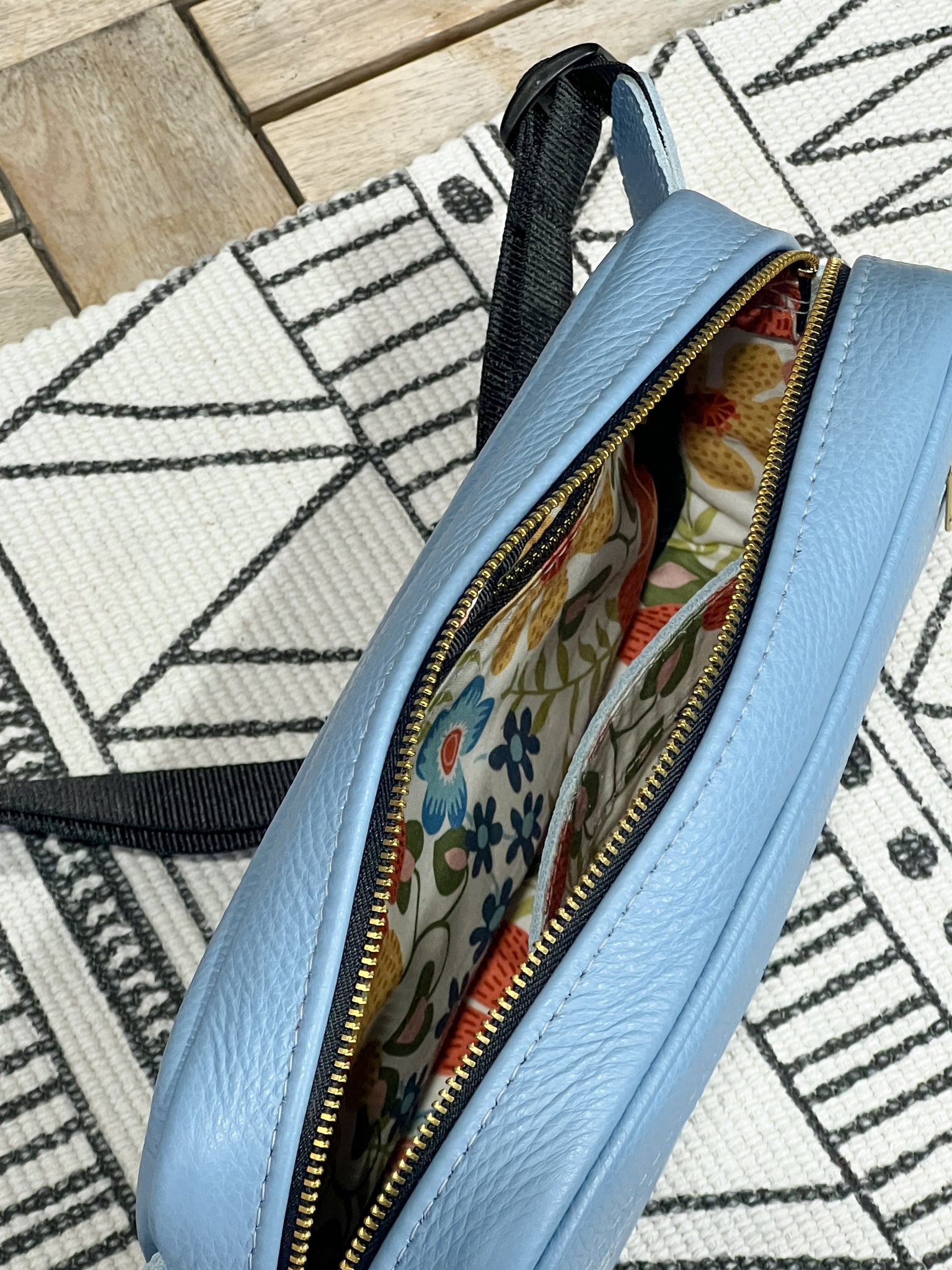 The leather is in our Arctic Ice Blue and lined in our Boho Inspired Floral.