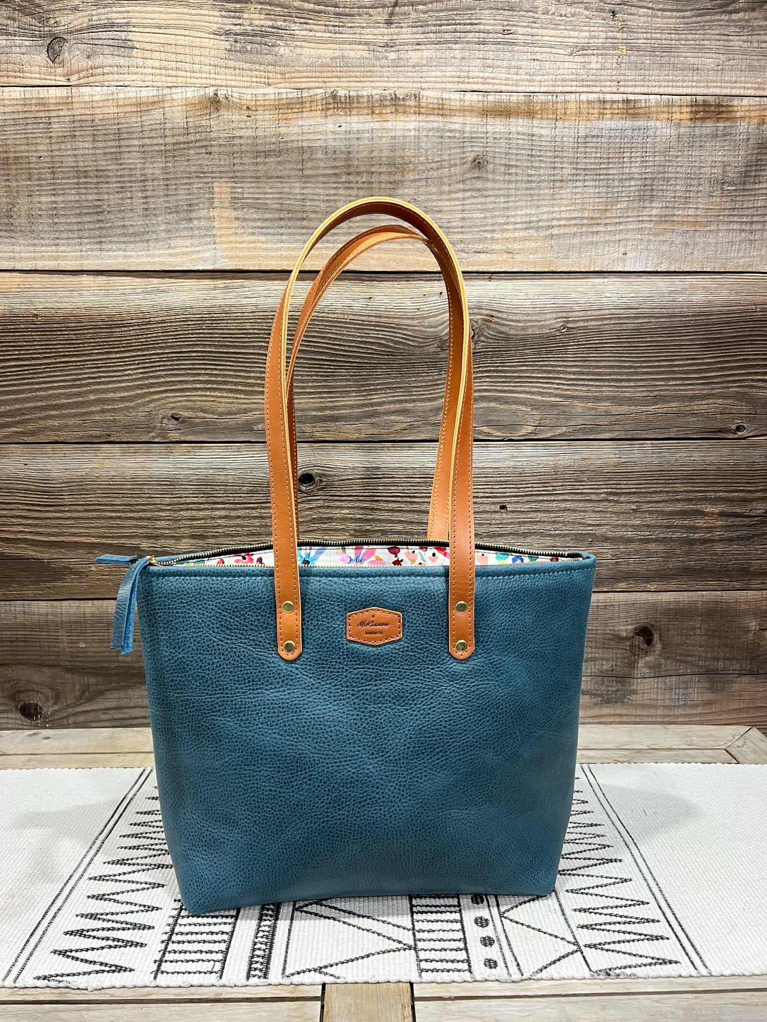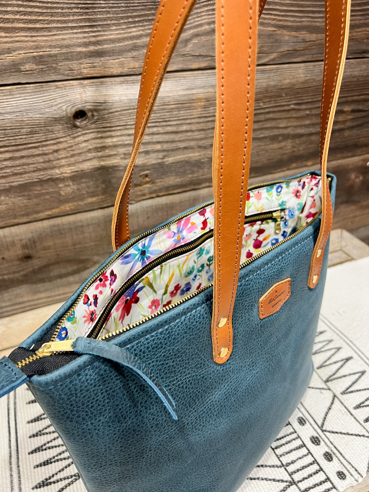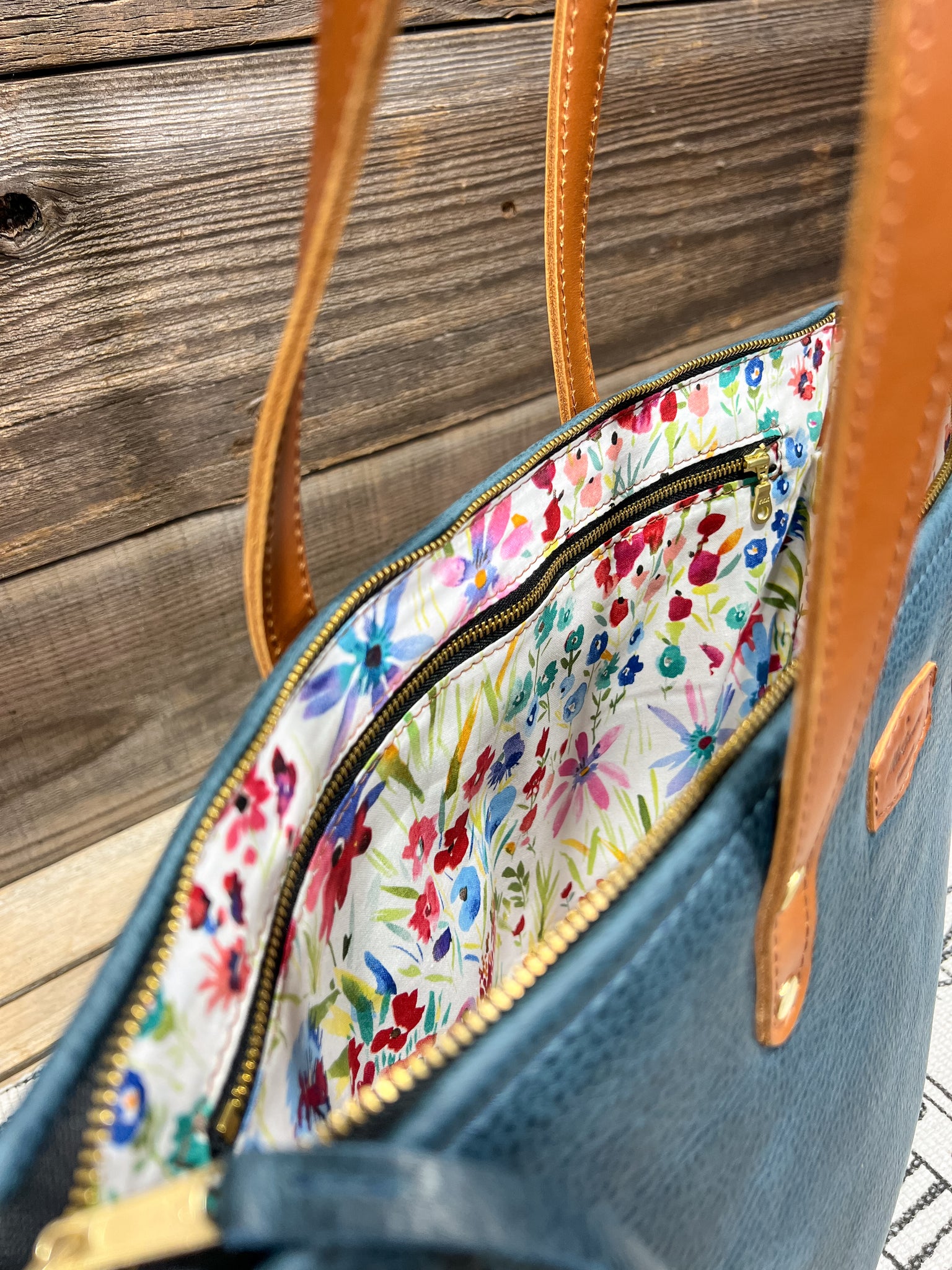 The leather is in our Blueberry Bullhide and lined in our Watercolor Wildflowers fabric.