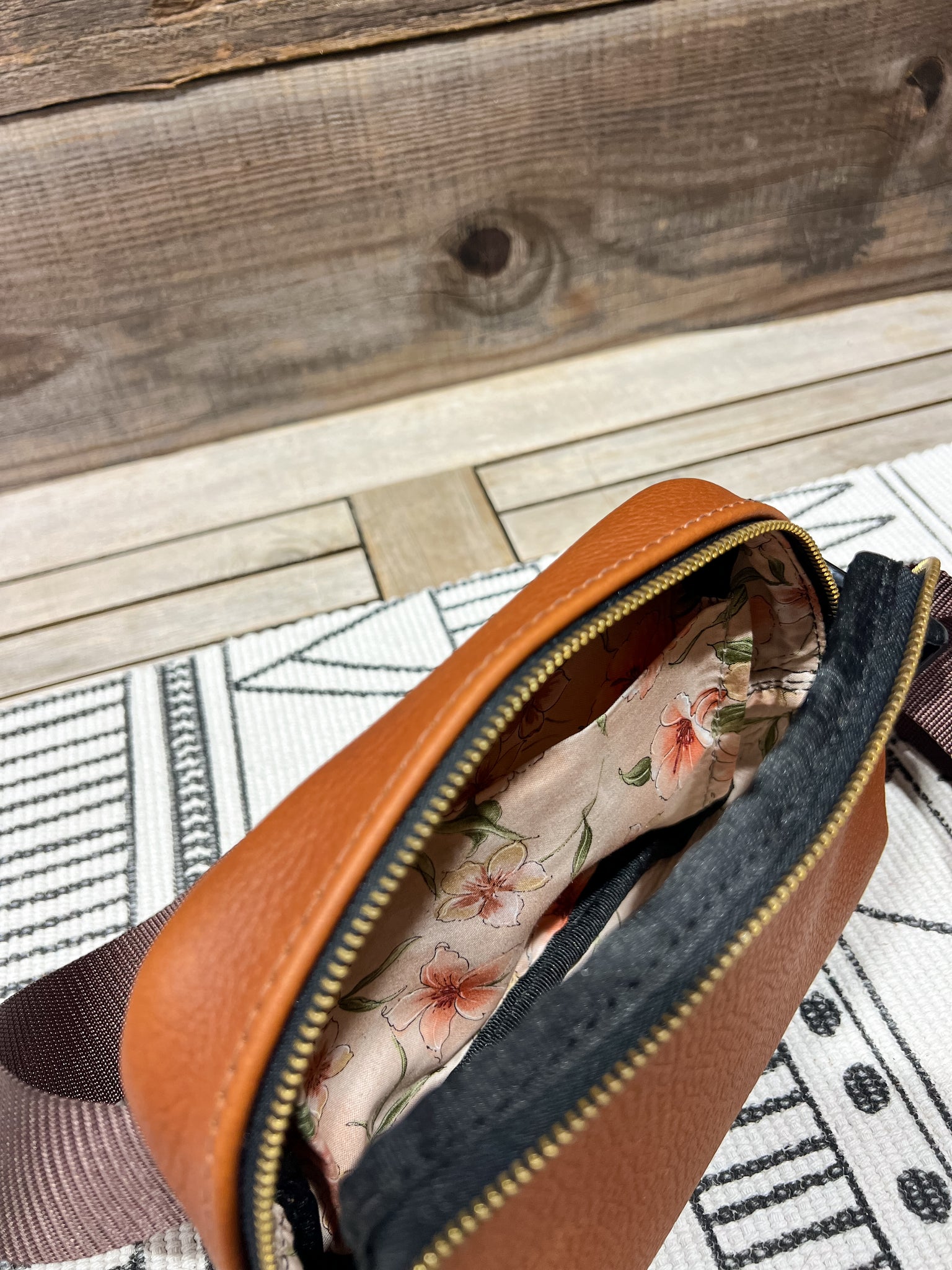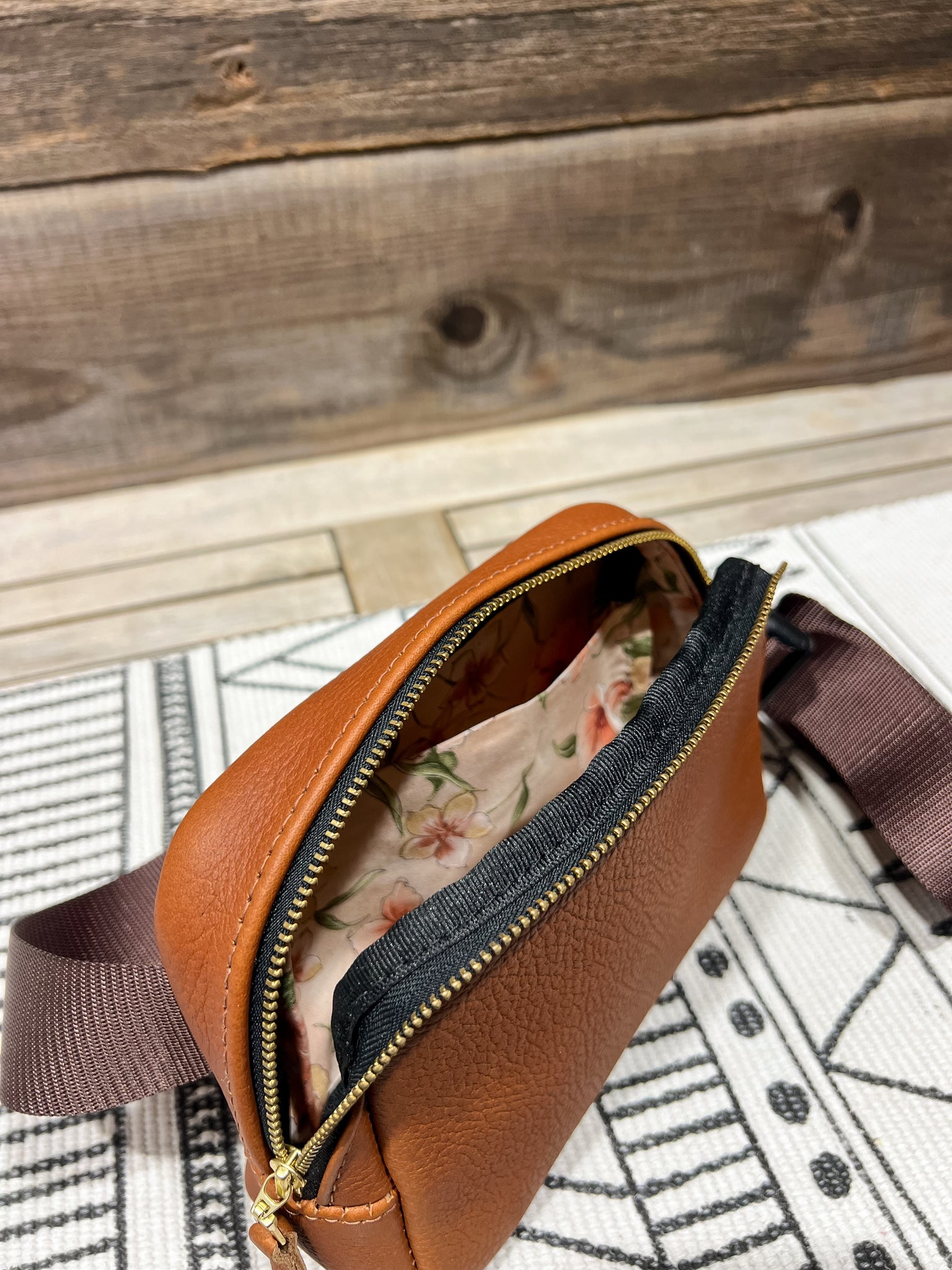 The leather is in our Gingerbread Brown and lined in our Soft Pink Floral fabric.
