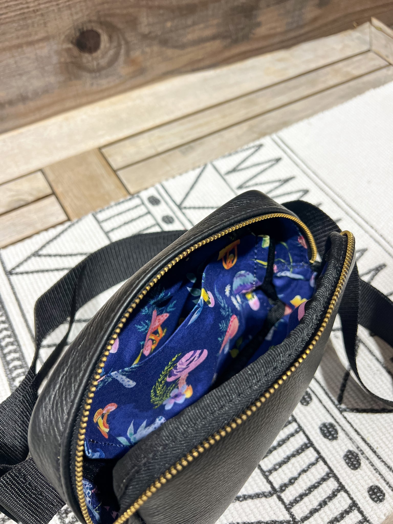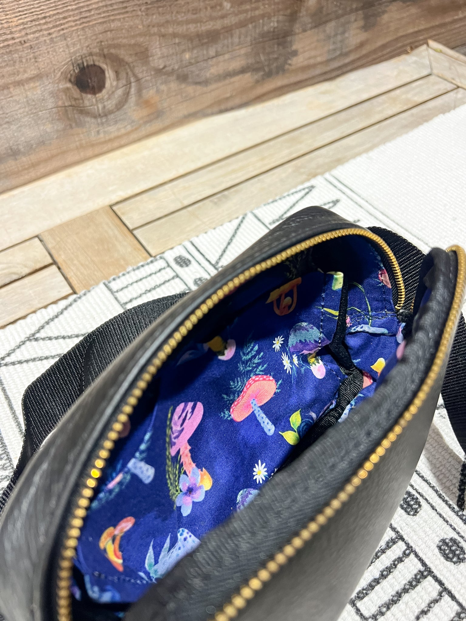 The leather is in our Classic Pebbled Black and lined in our Psychedelic Colorful Mushrooms fabric.