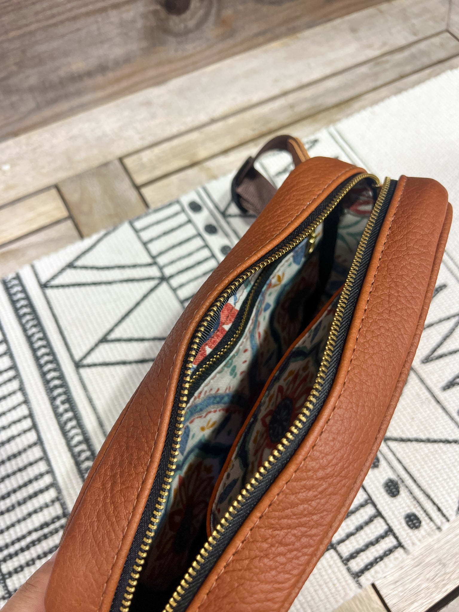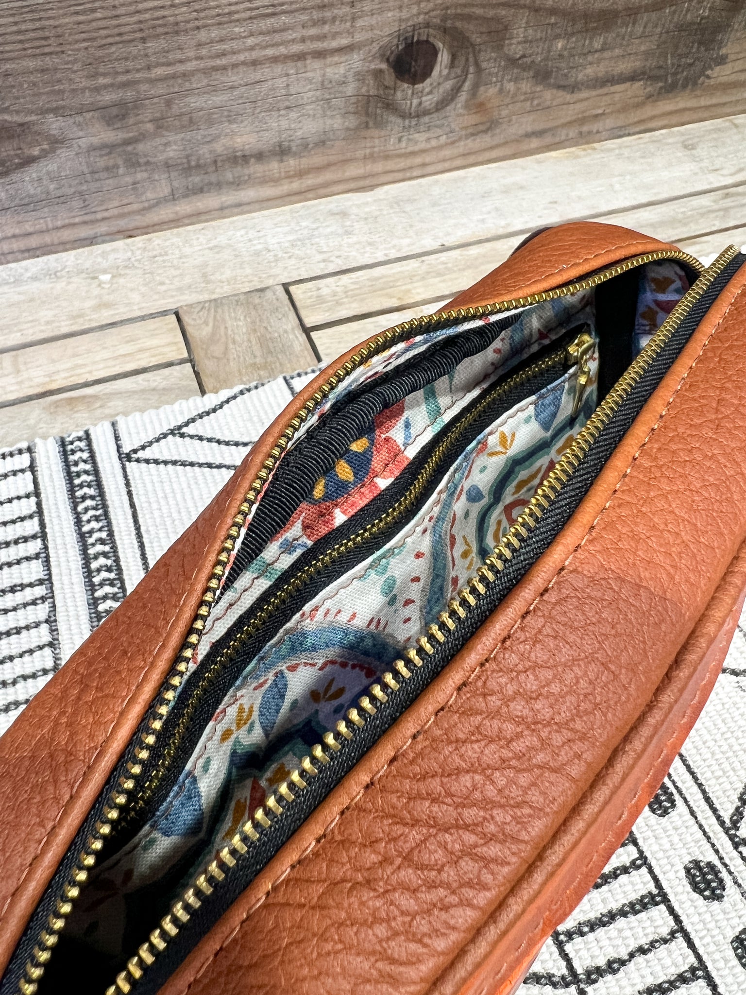 The leather is in our in our colorblocking-inspired Hickory Brown Sugar and lined in our Blue Paisleys.