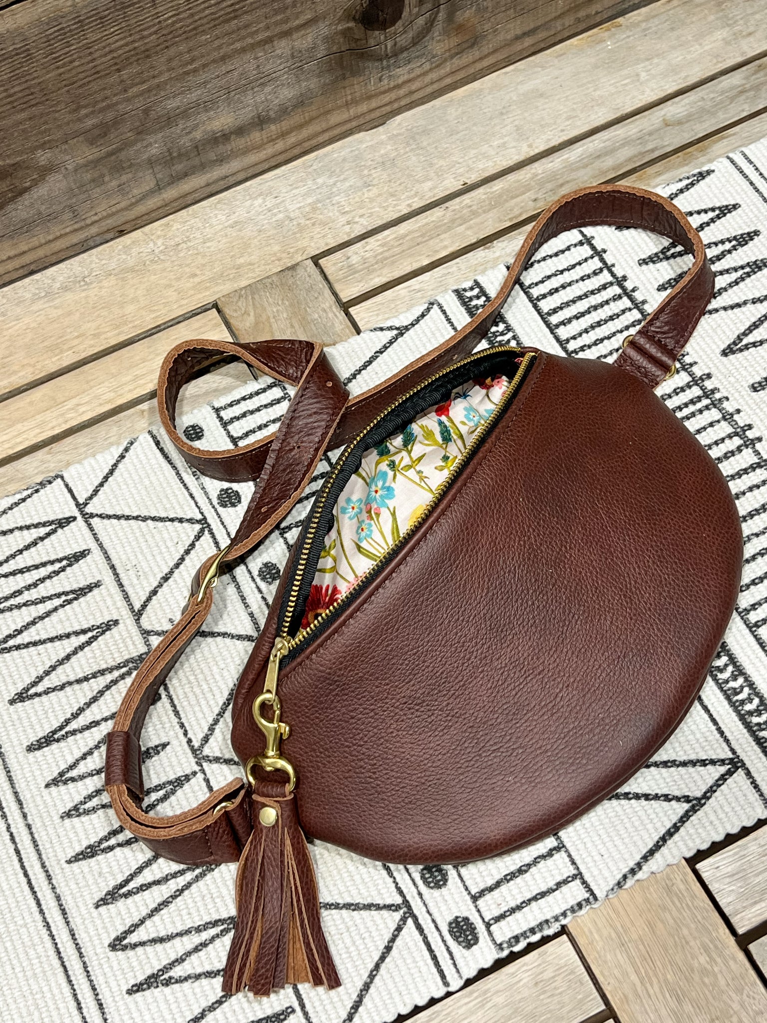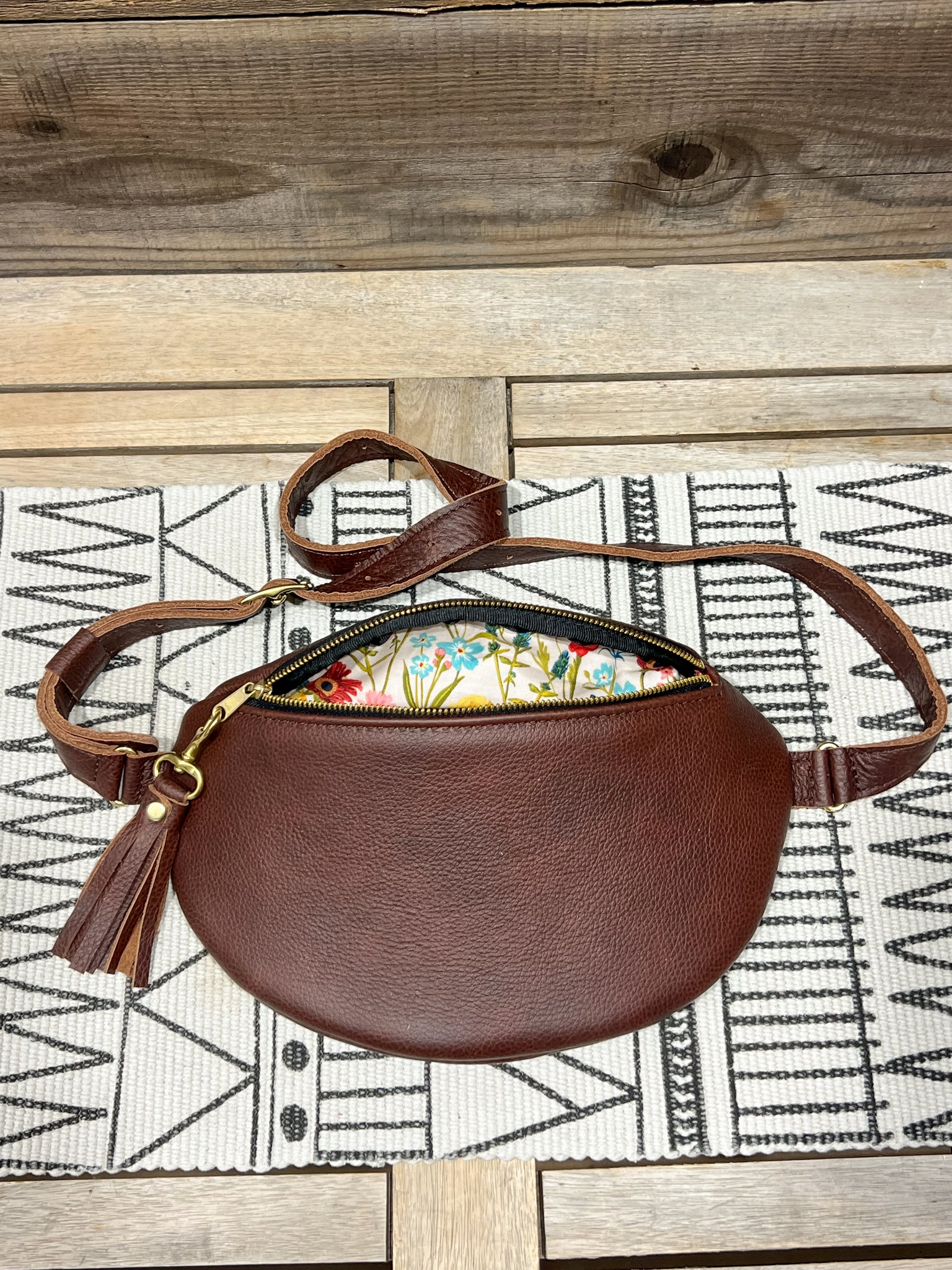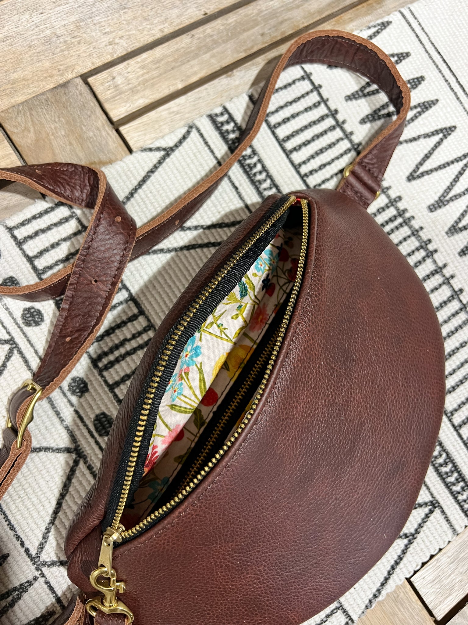 The leather is in our Dark Espresso Brown and lined in our Fields of Wildflowers fabric.