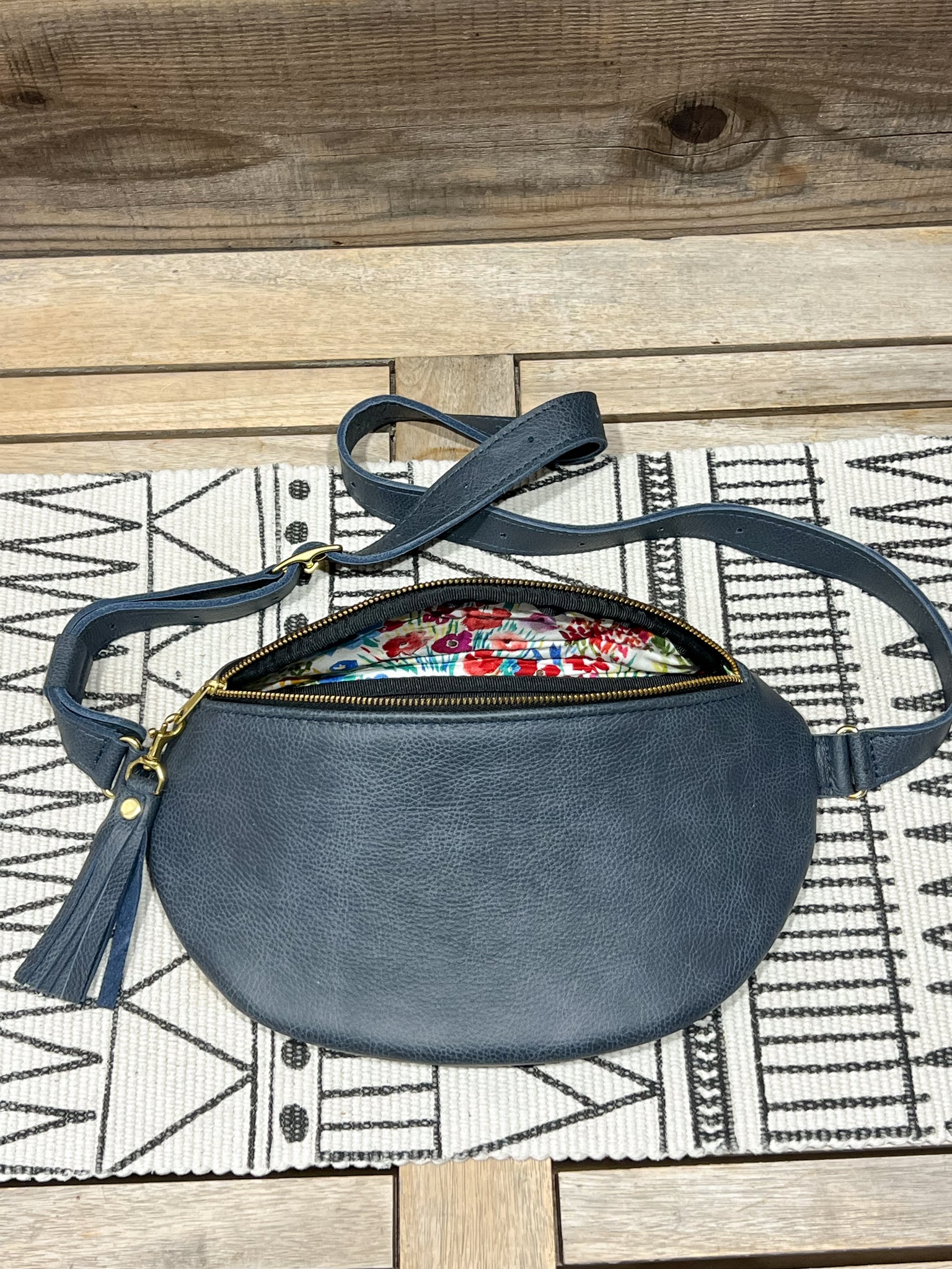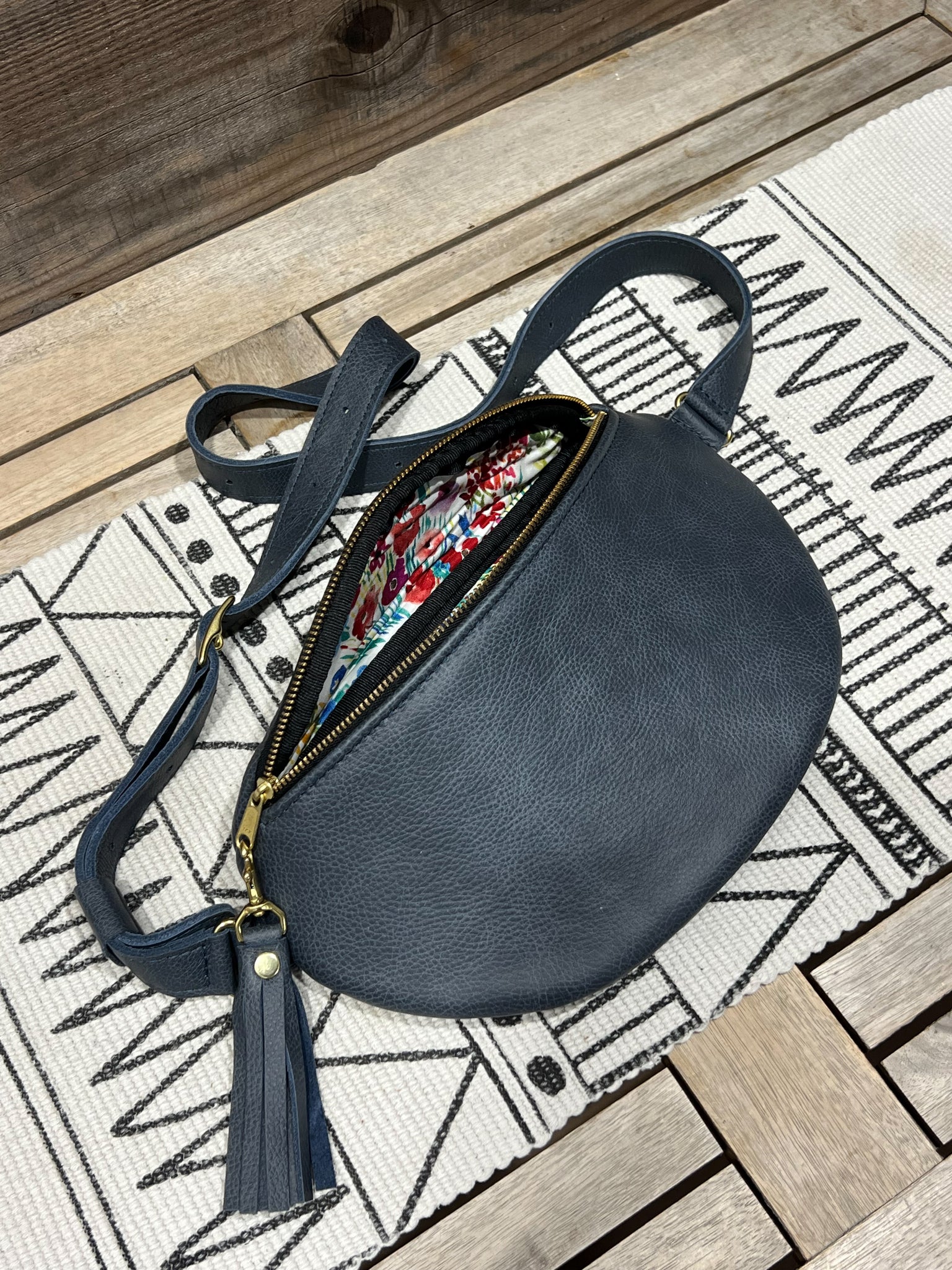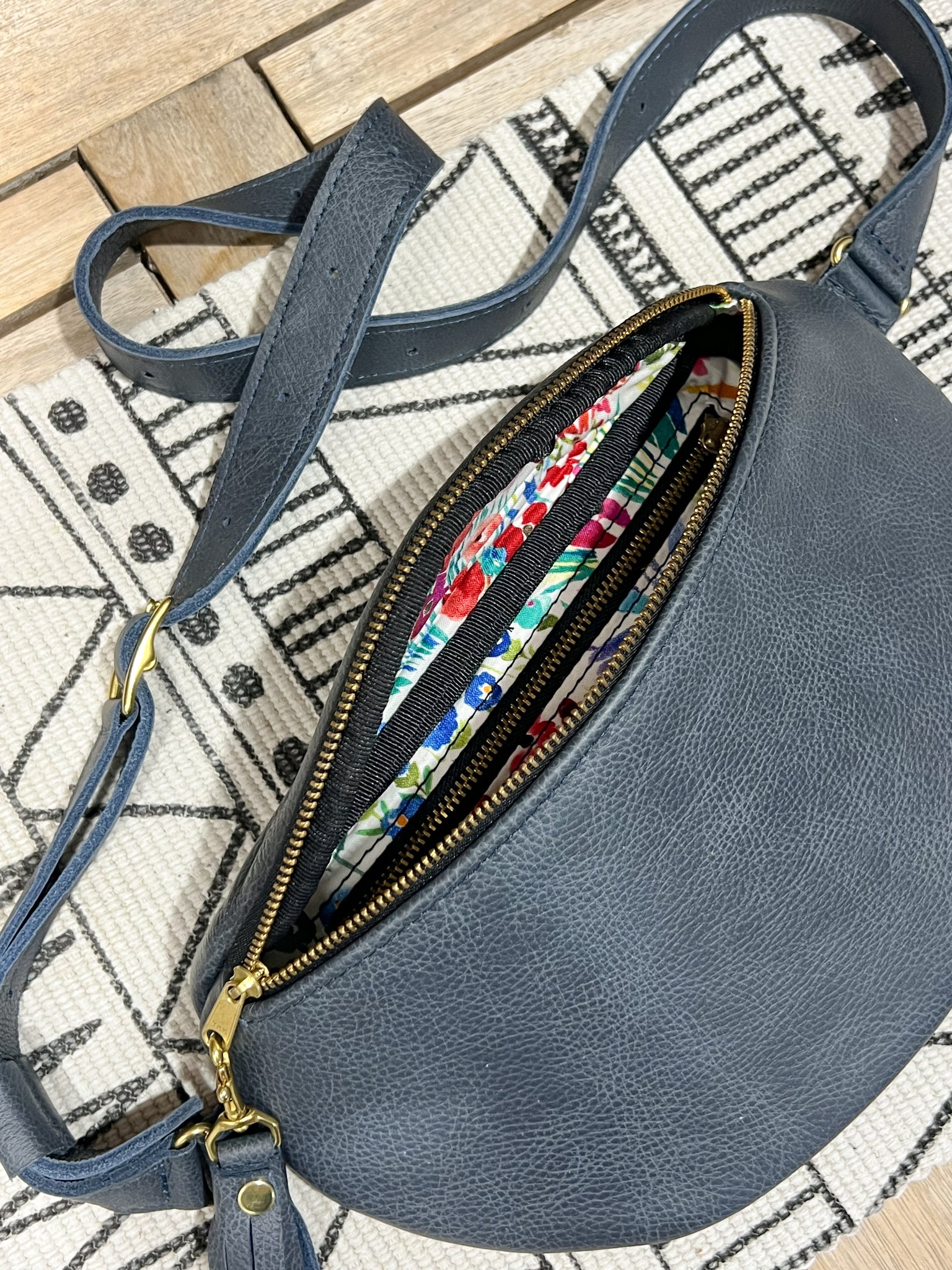 The leather is in our Denim Blue and lined in our Bright Fields of Wildflowers fabric.
