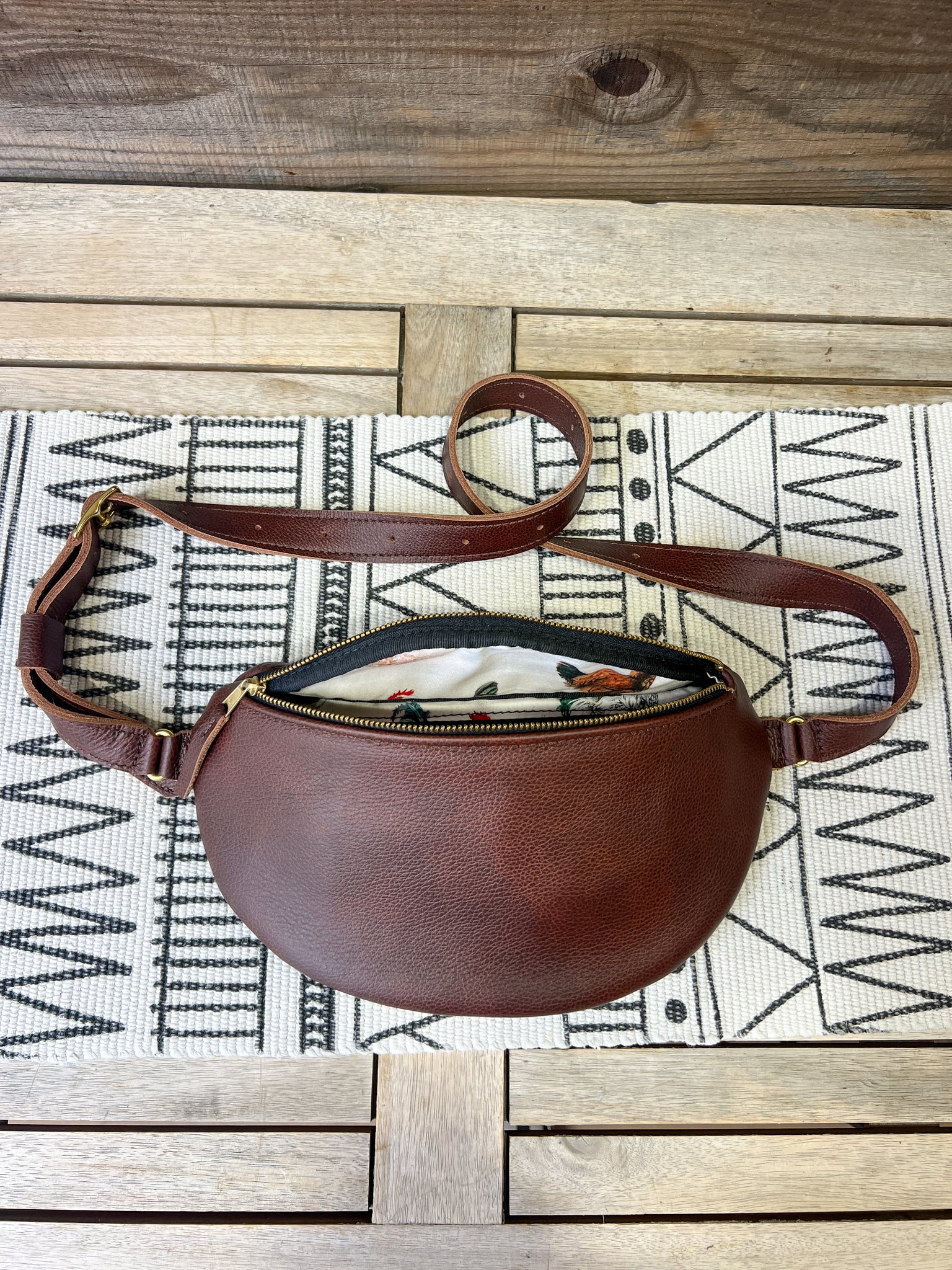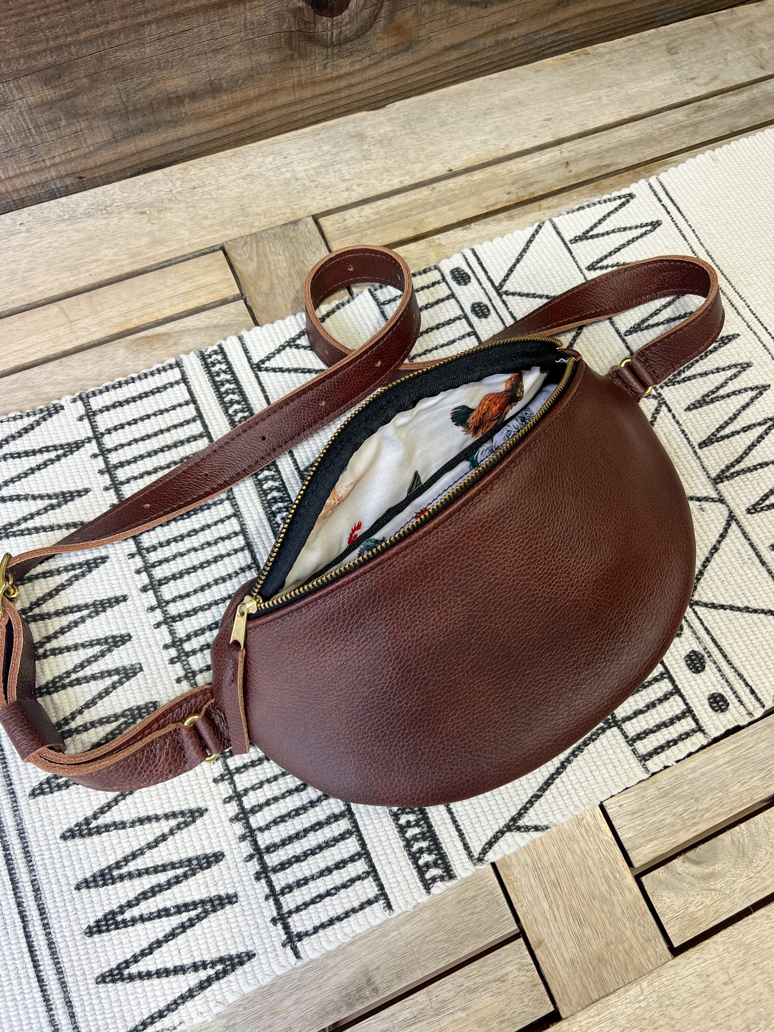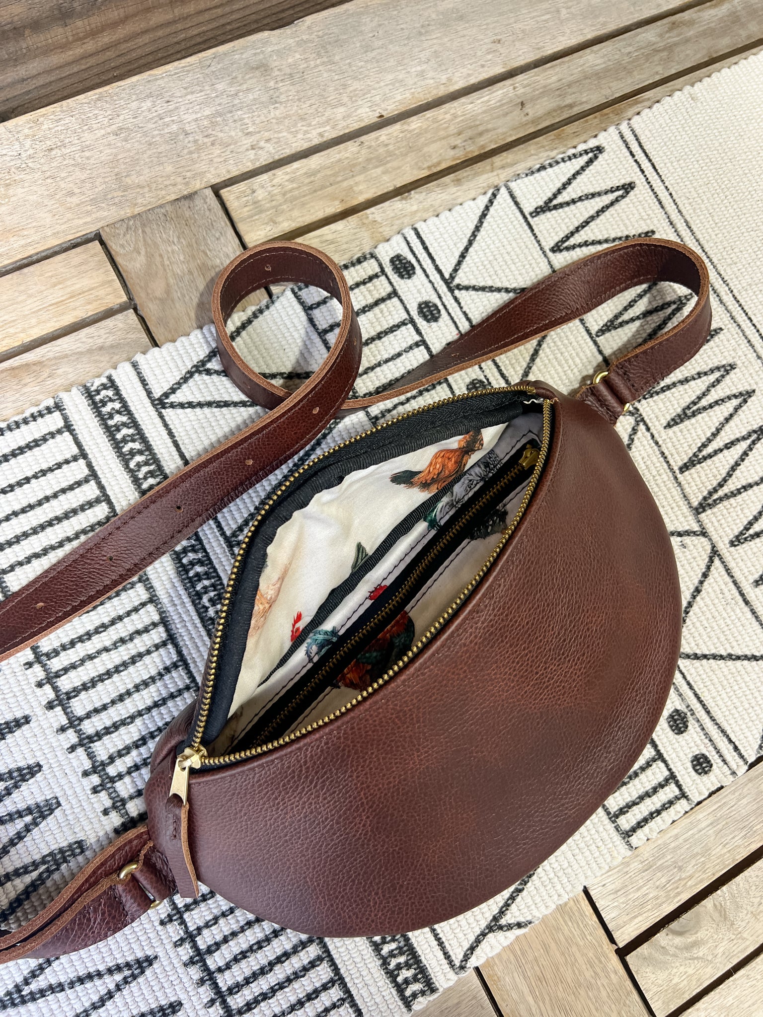 The leather is in our Dark Espresso Brown and lined in our Chickens & Roosters fabric.