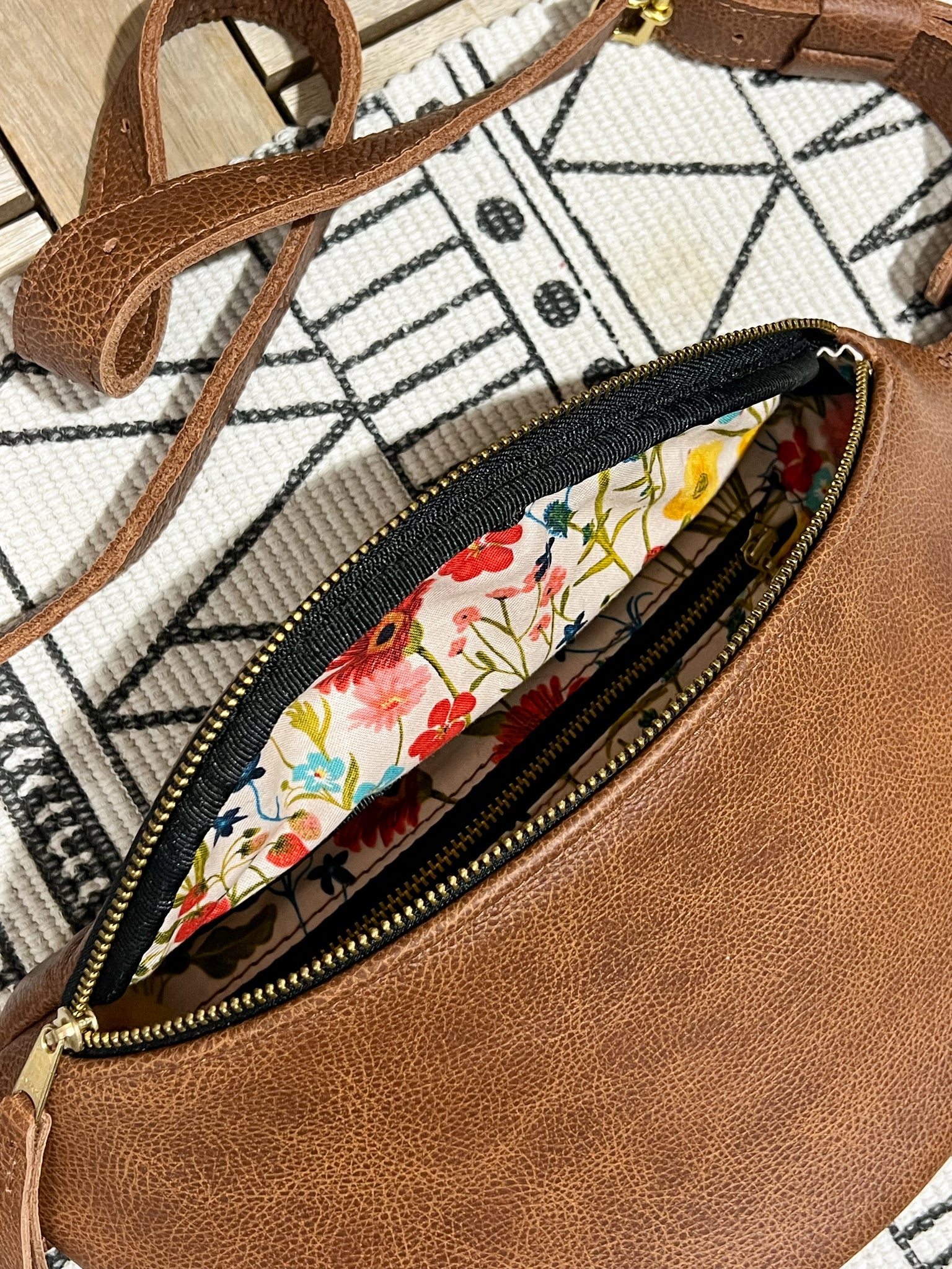 The leather is in our Hot Cocoa and lined in our Field of Wildflowers fabric.