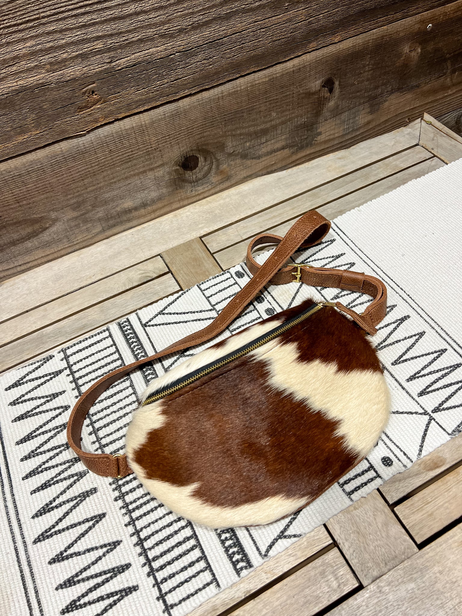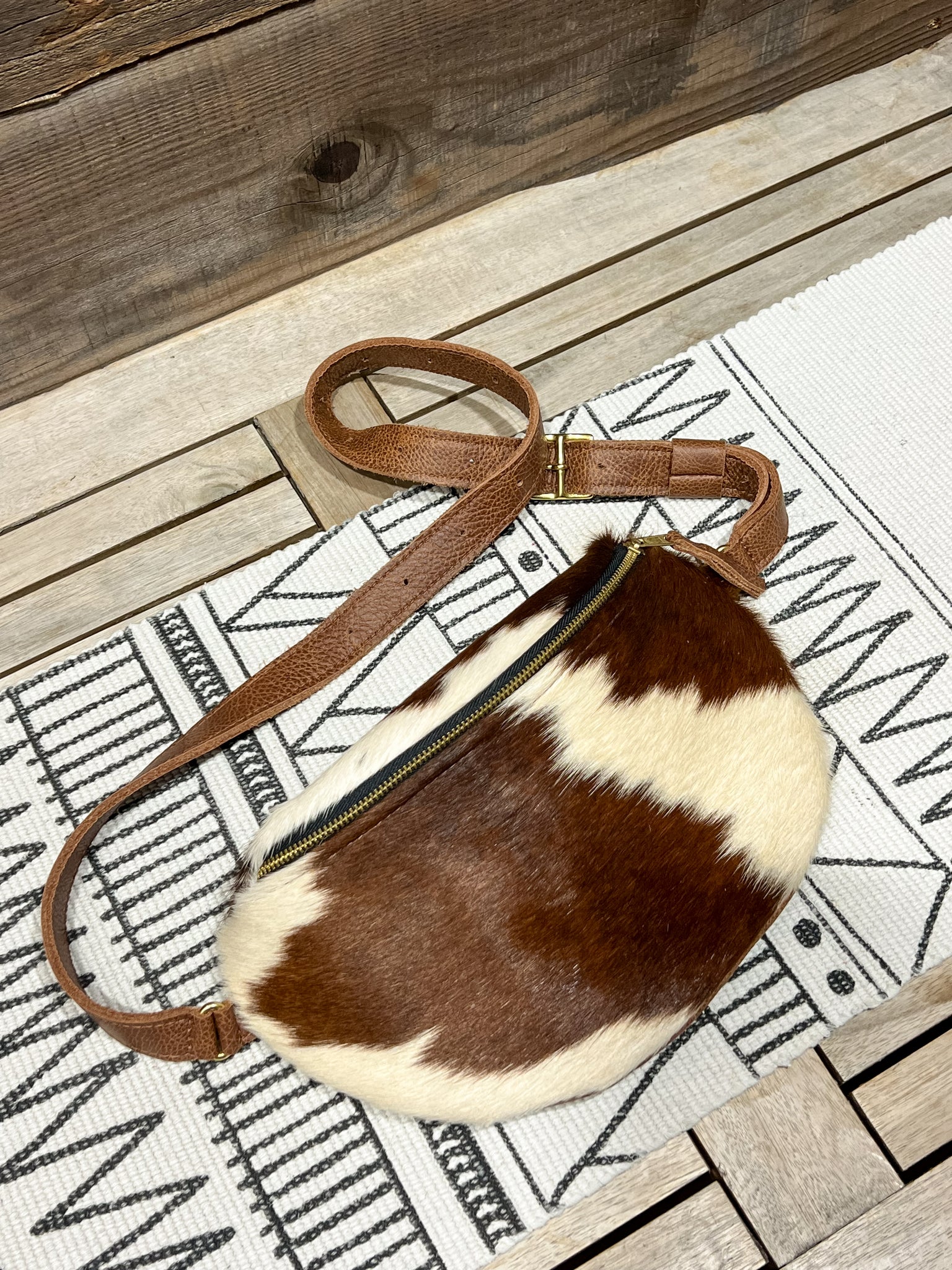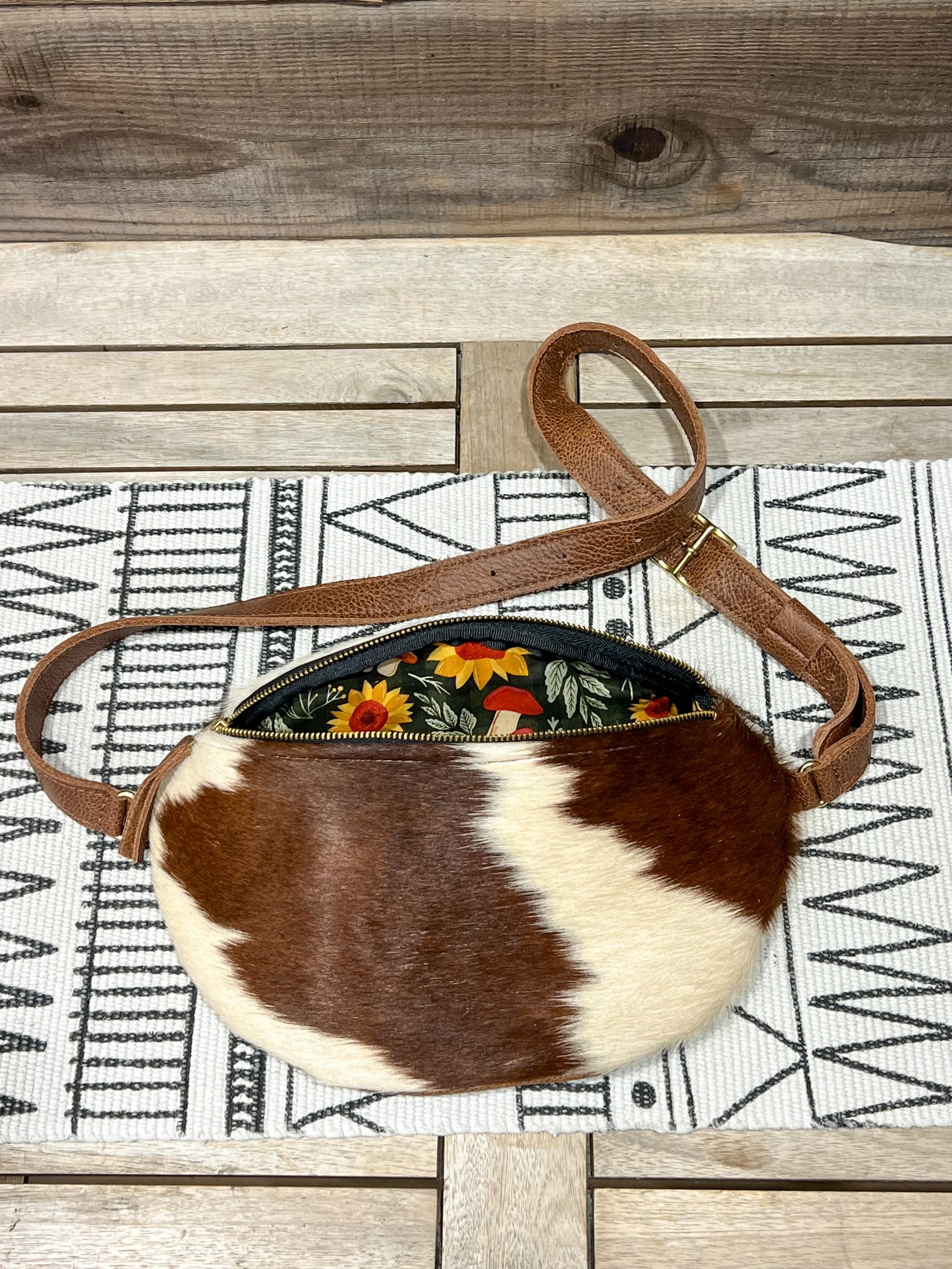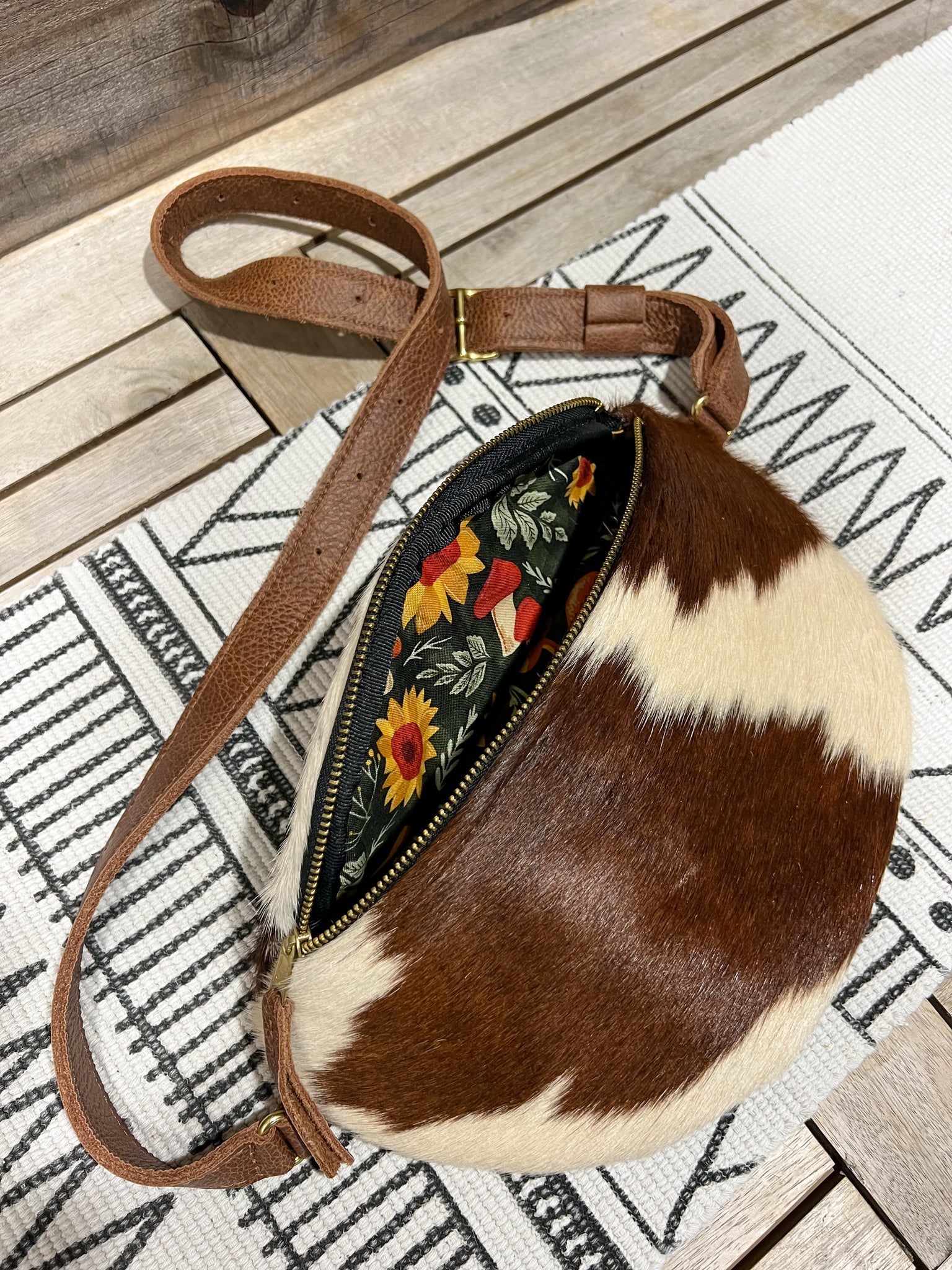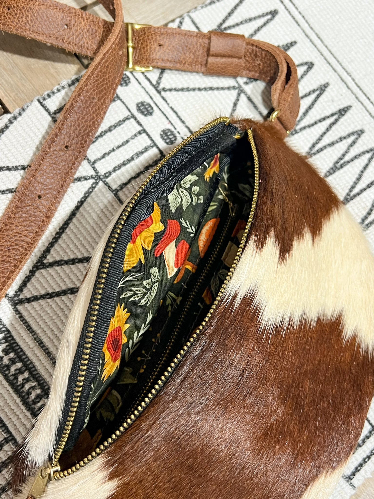 The leather is in our Brown & White Hair on Hide and lined in our Mystical Forest Mushrooms fabric.