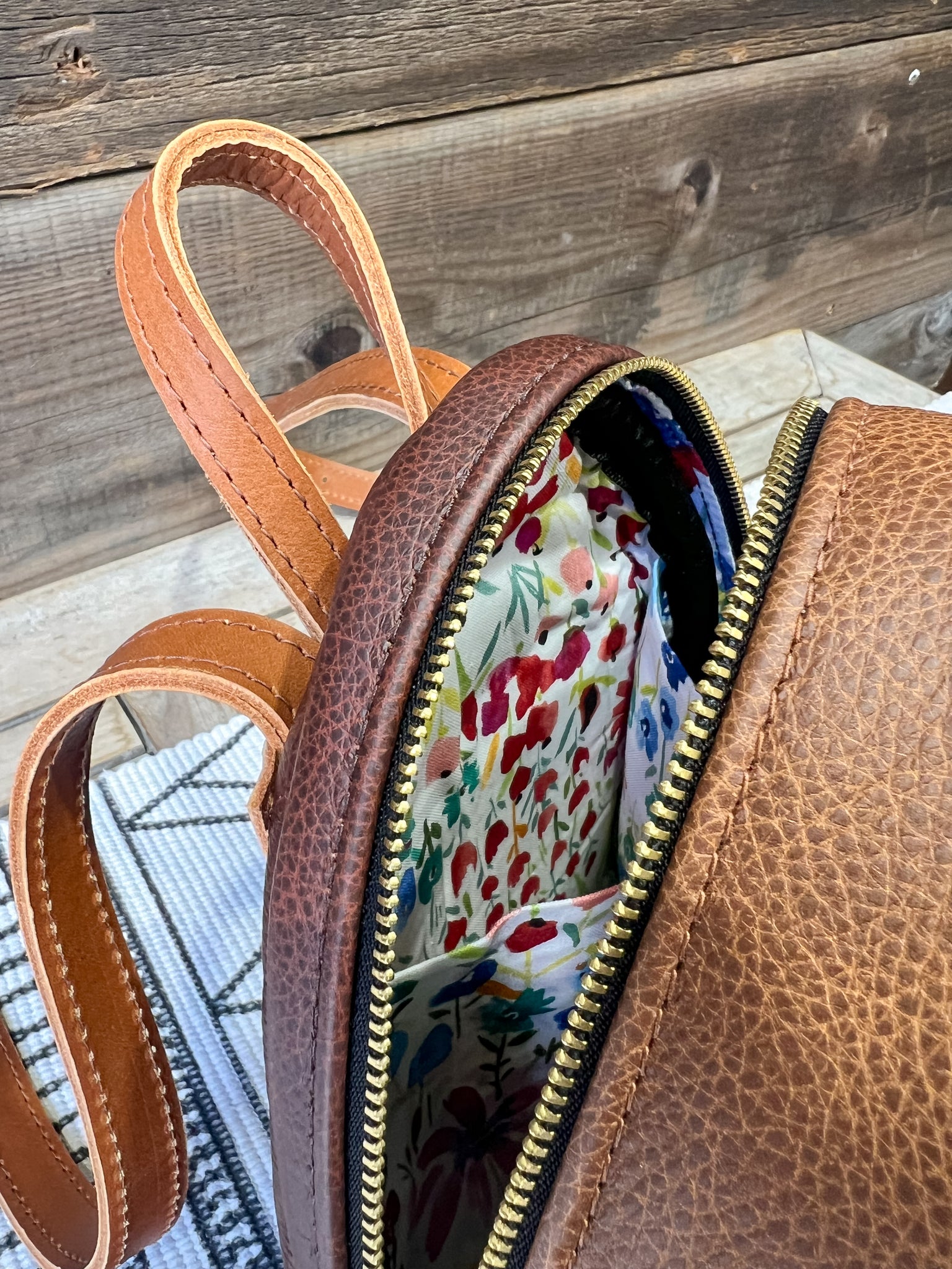 The leather is in our Brown Sugar Mix which includes our Hot Cocoa & Dark Espresso Hides for a Two-Toned look and lined in our Watercolor Wildflowers fabric.