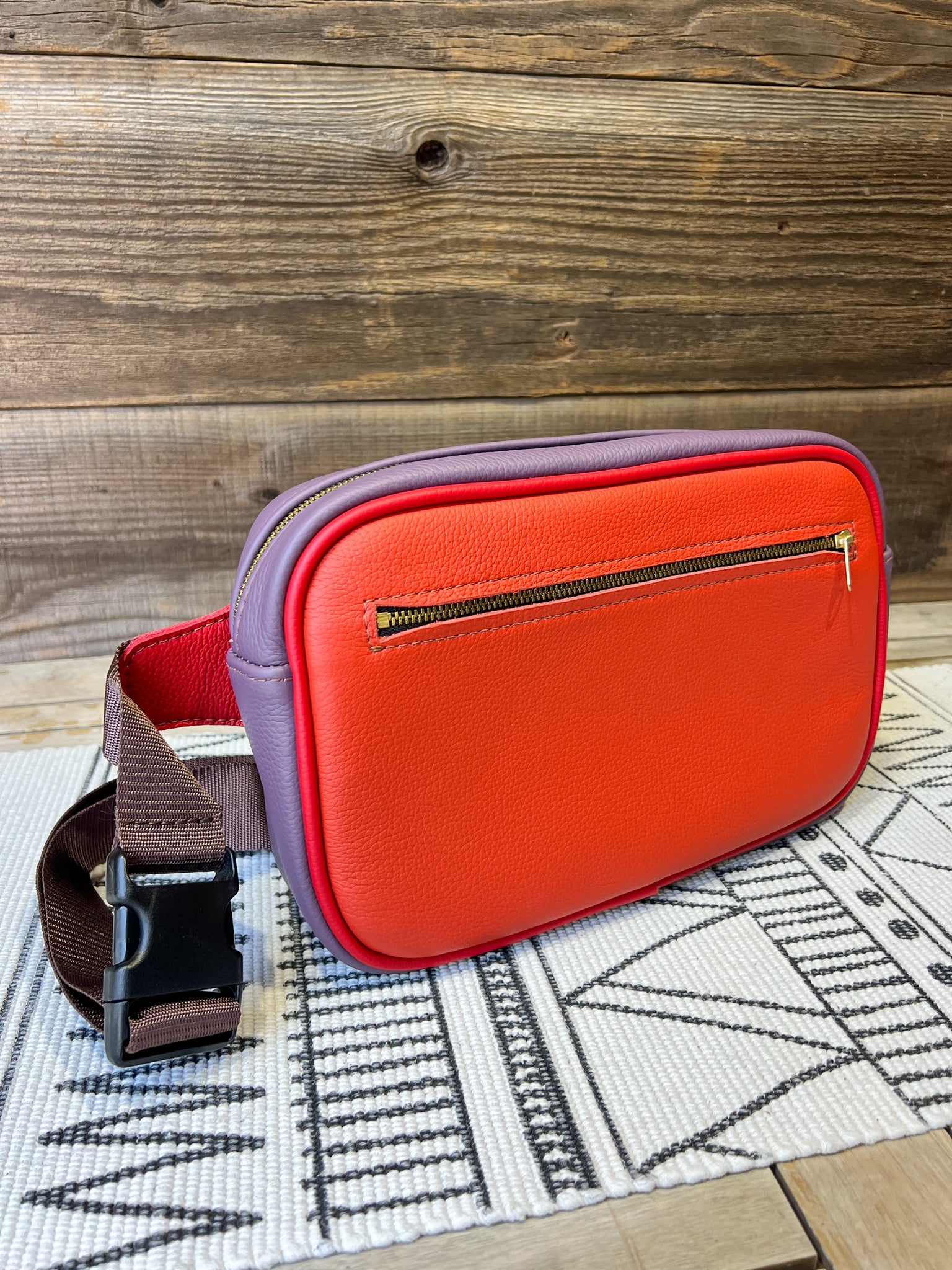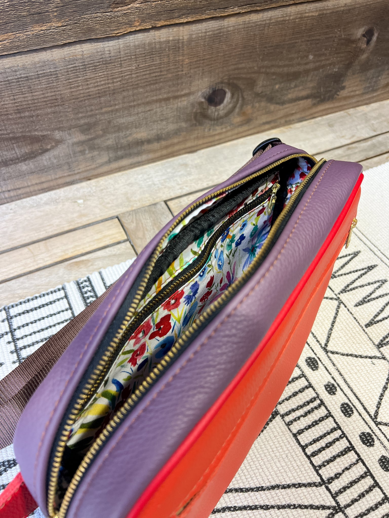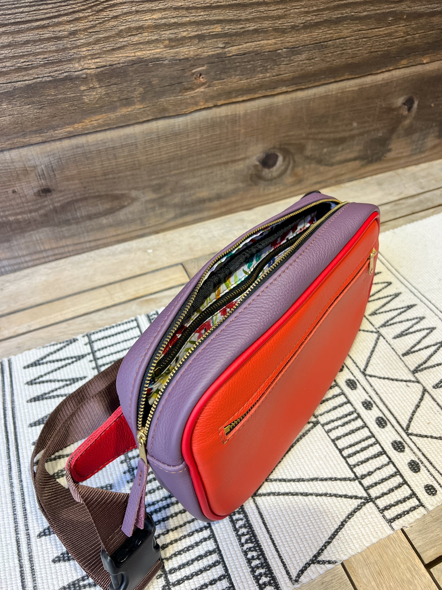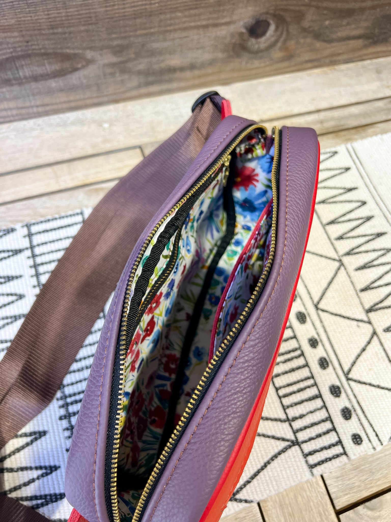 The leather is in our Spicy Mix and lined in our Watercolor Field of Wildflowers.