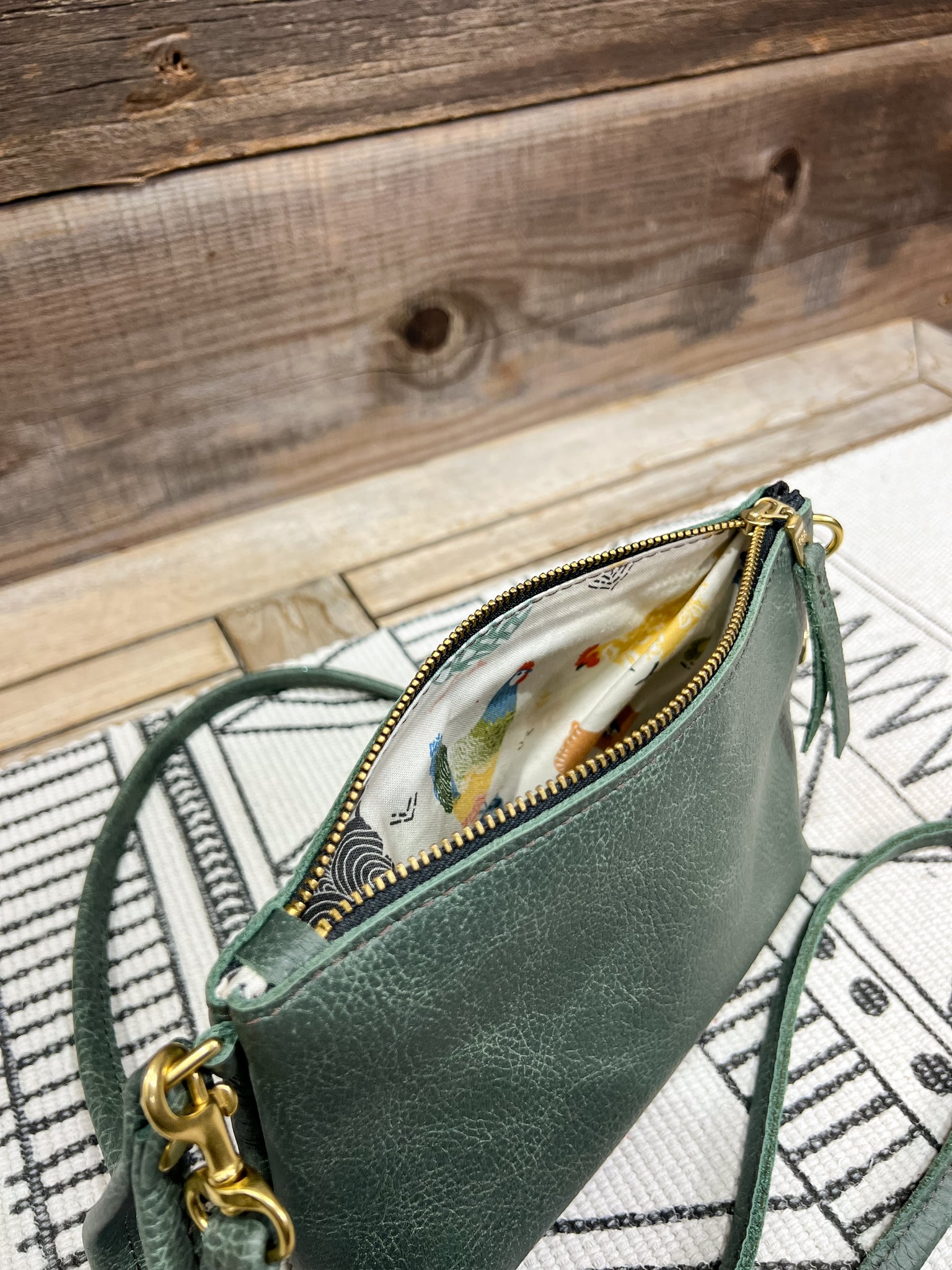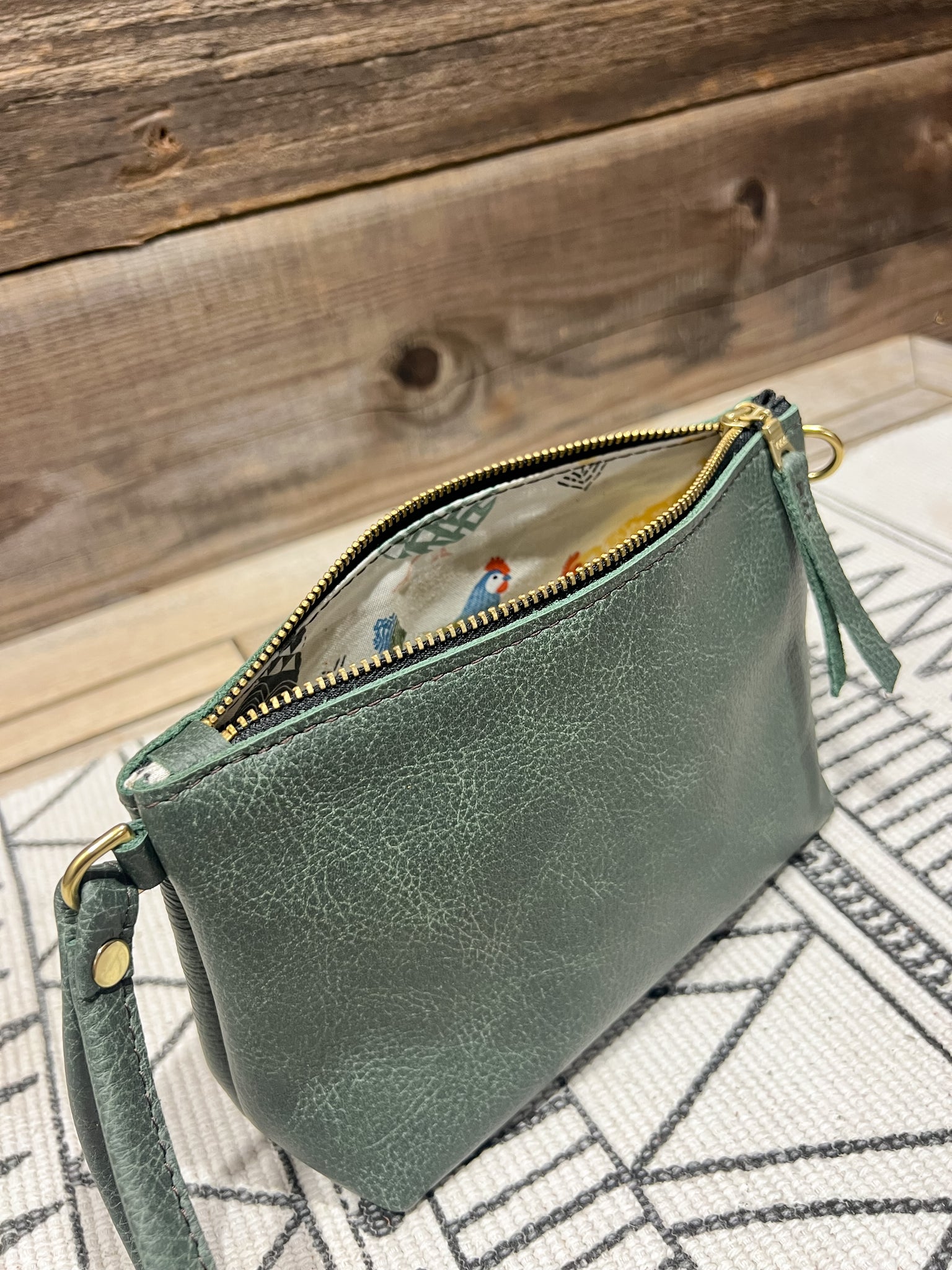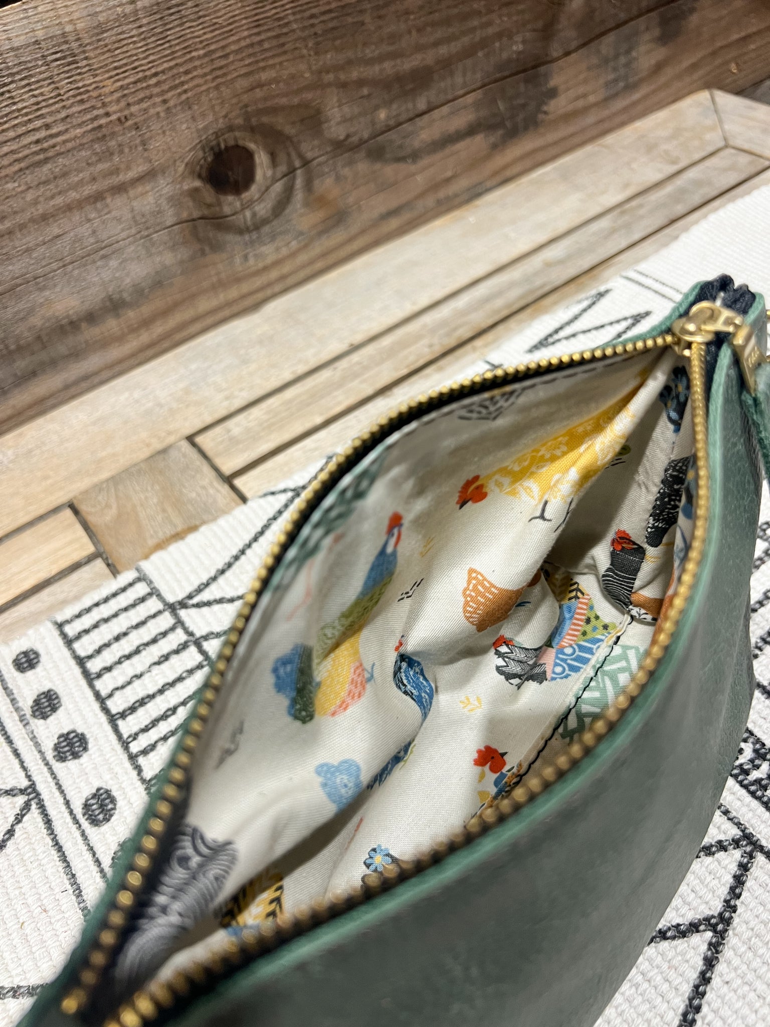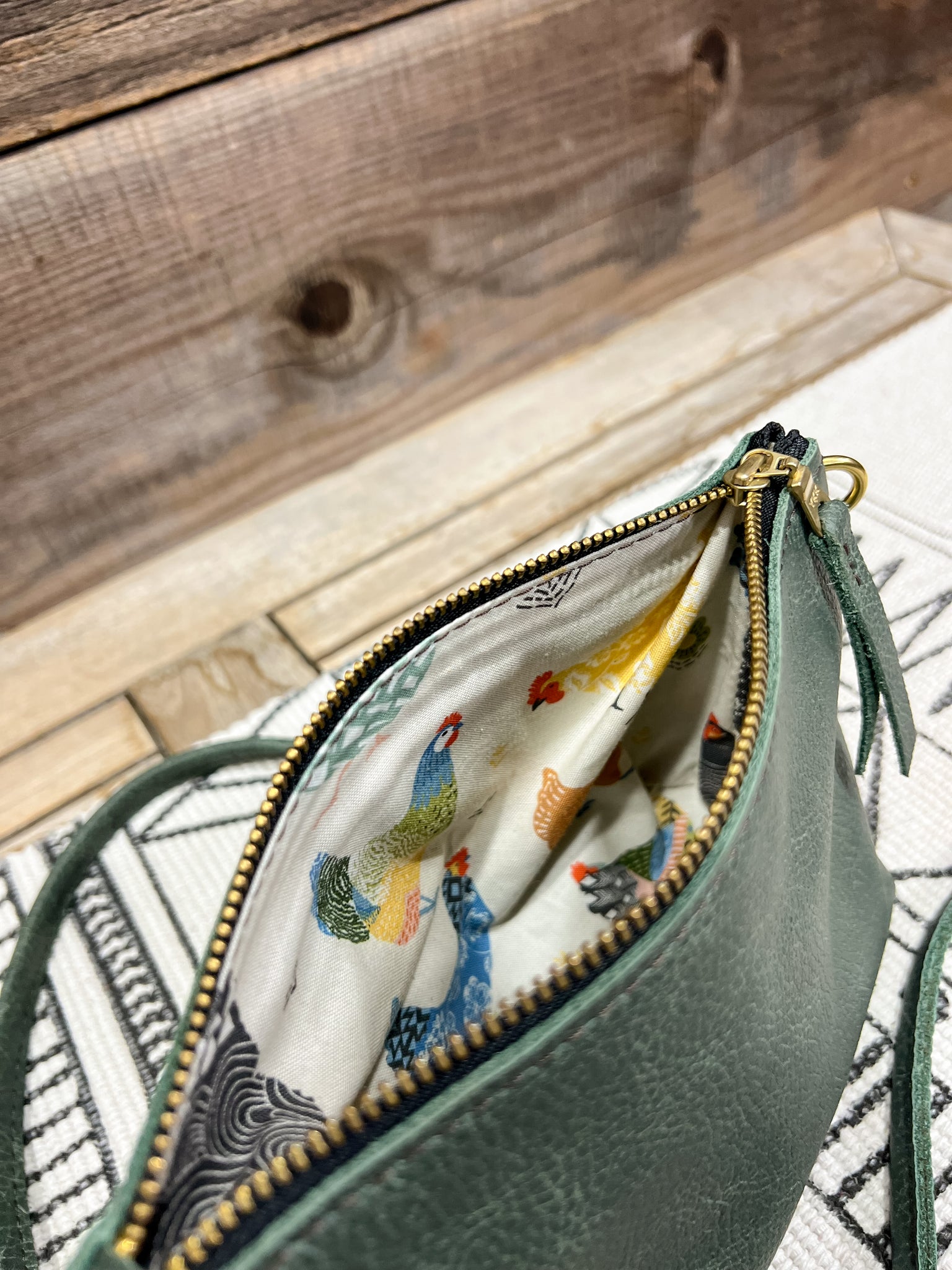This is in our Spanish Moss Green and lined in our Colorful Chickens fabric.