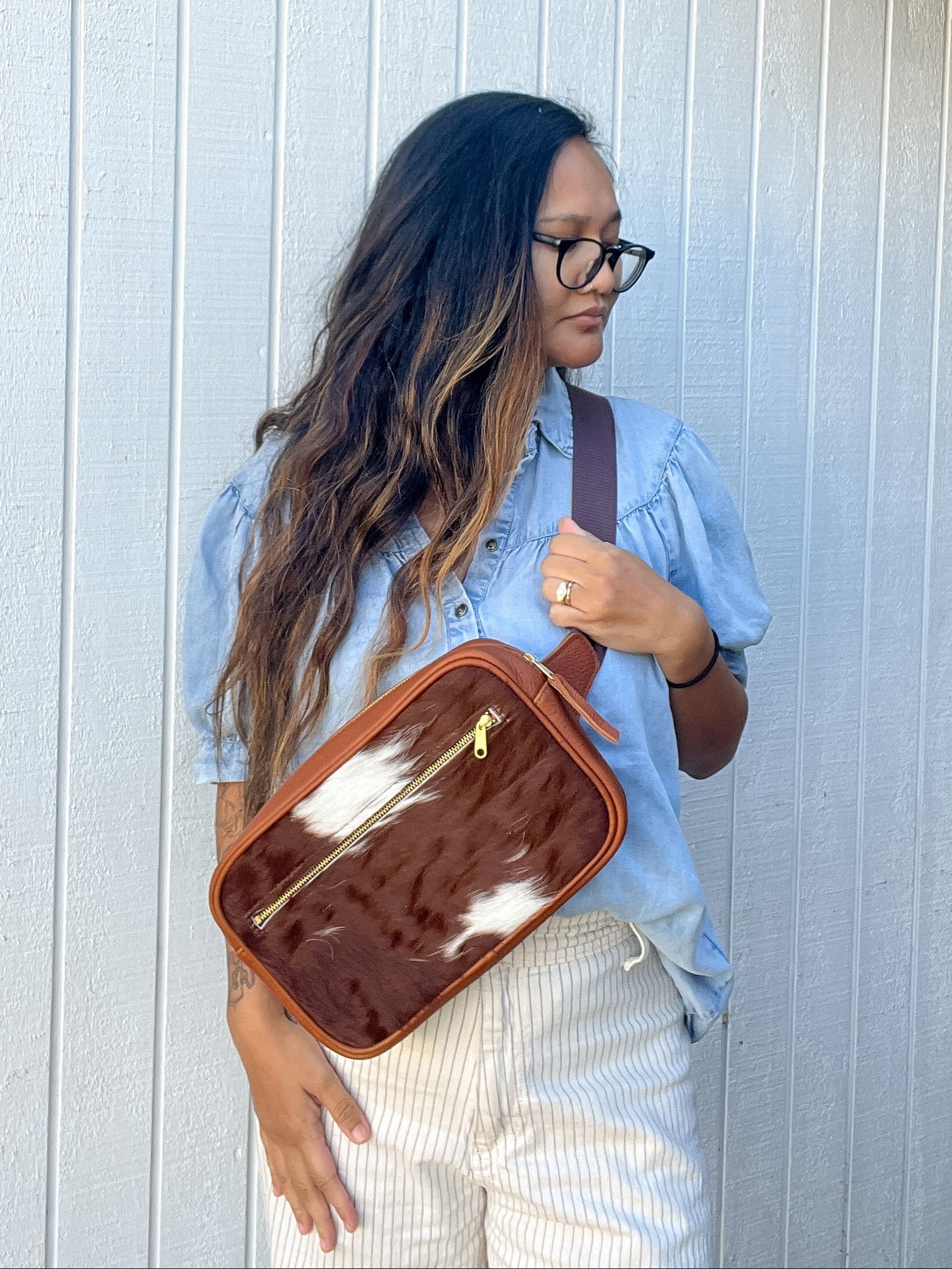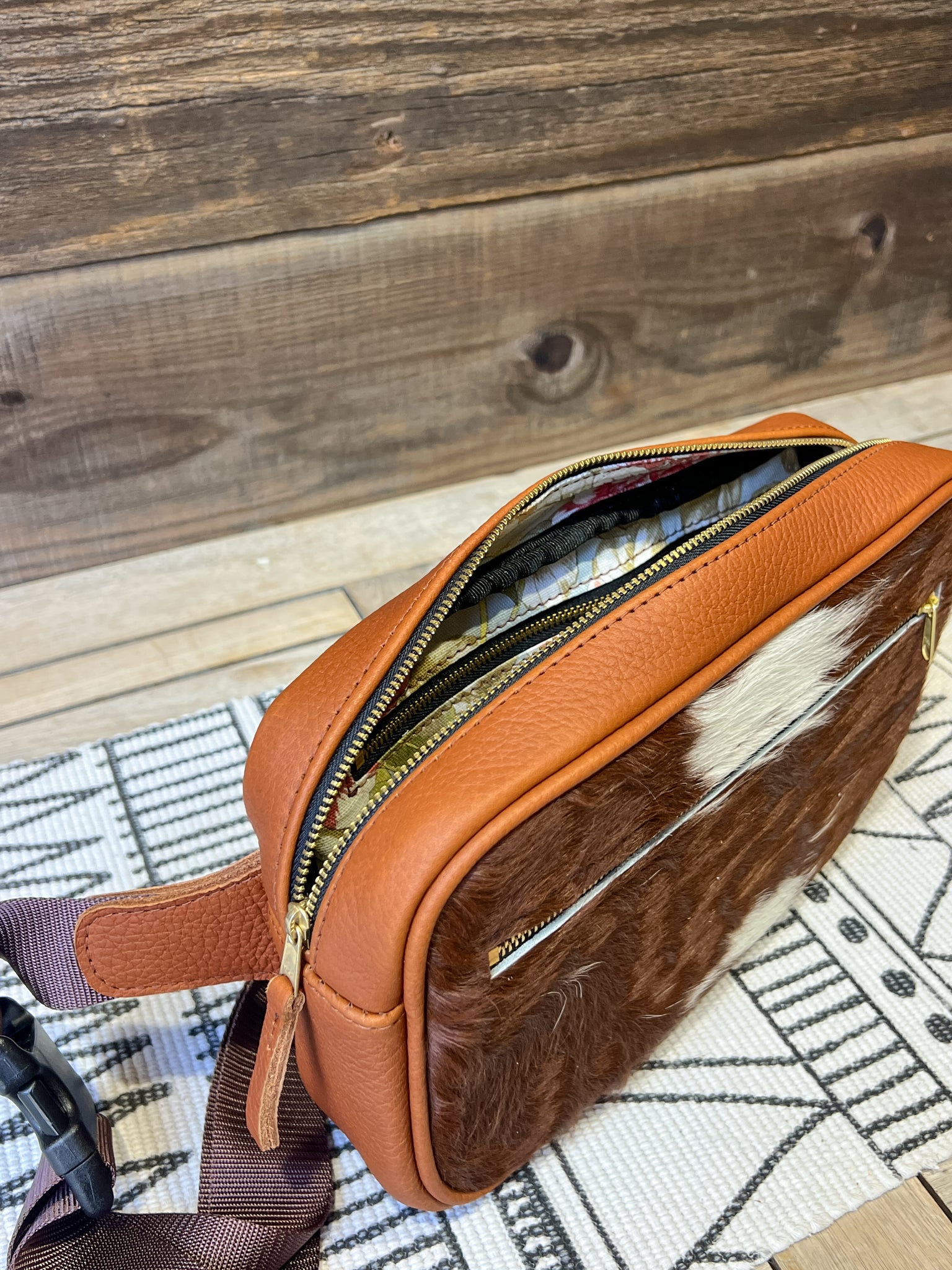 The leather is in our Dark Brown & White Hair on Hide and lined in our Light Blue Rose Garden.