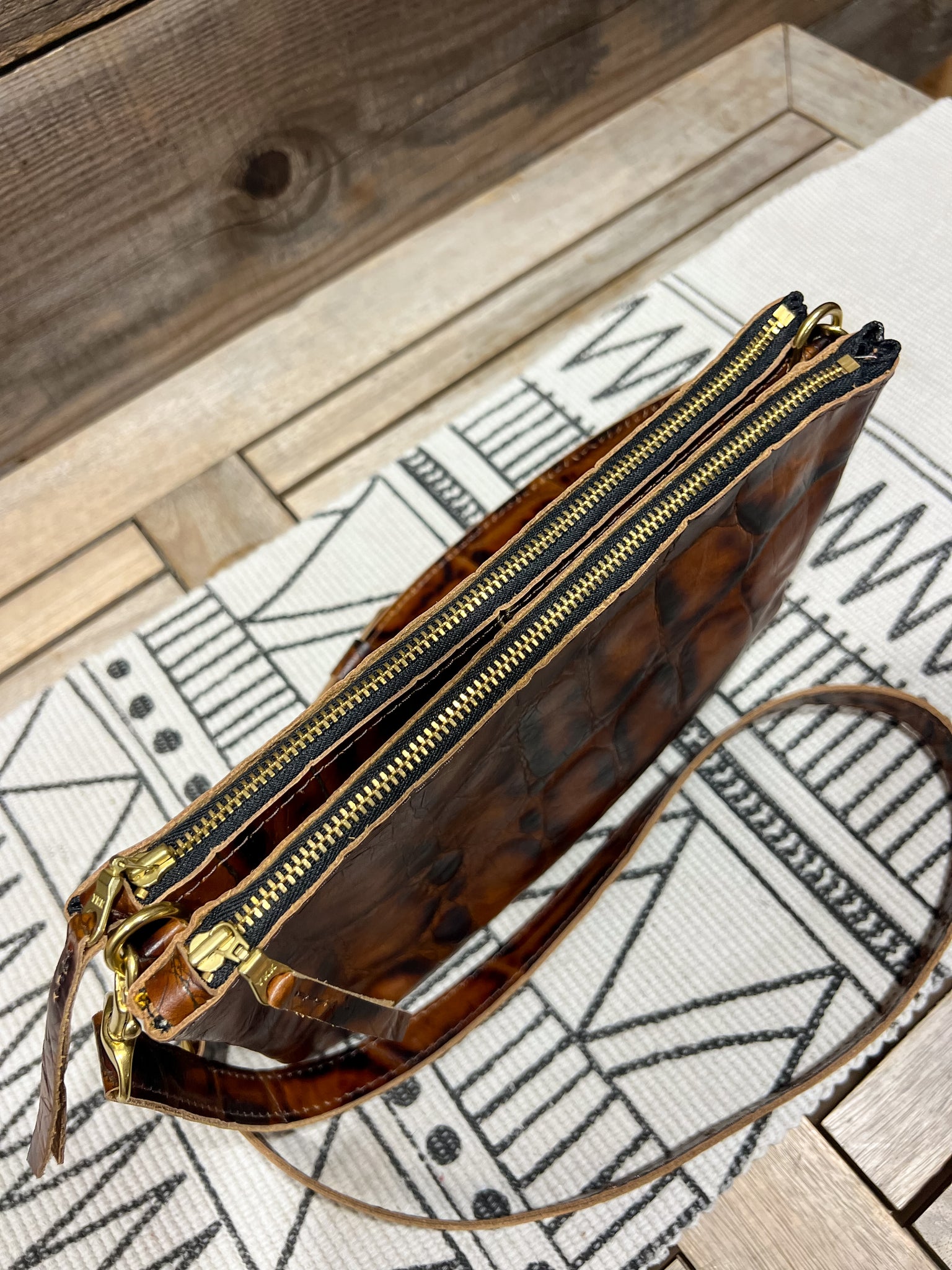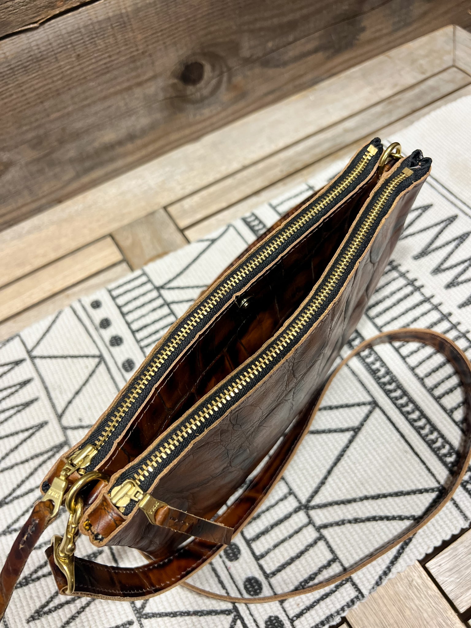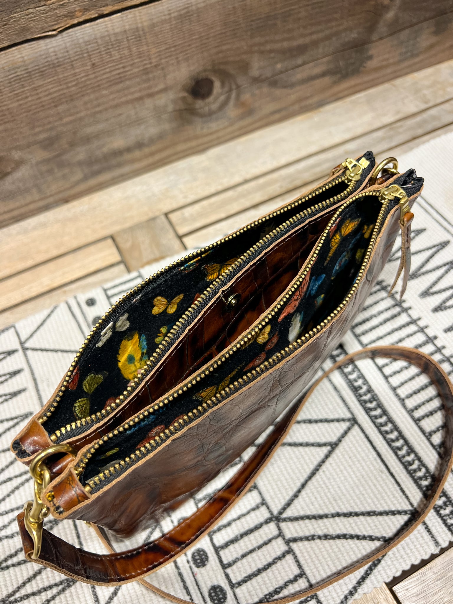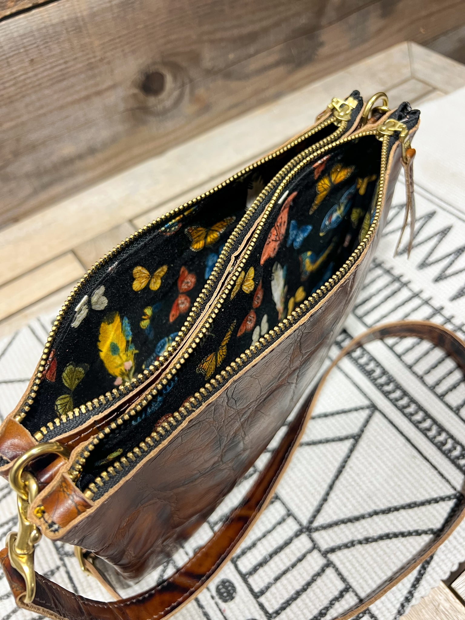 The leather is in our Embossed Tortoise Shell and lined in our Fluttering Feathers & Butterflies fabric.