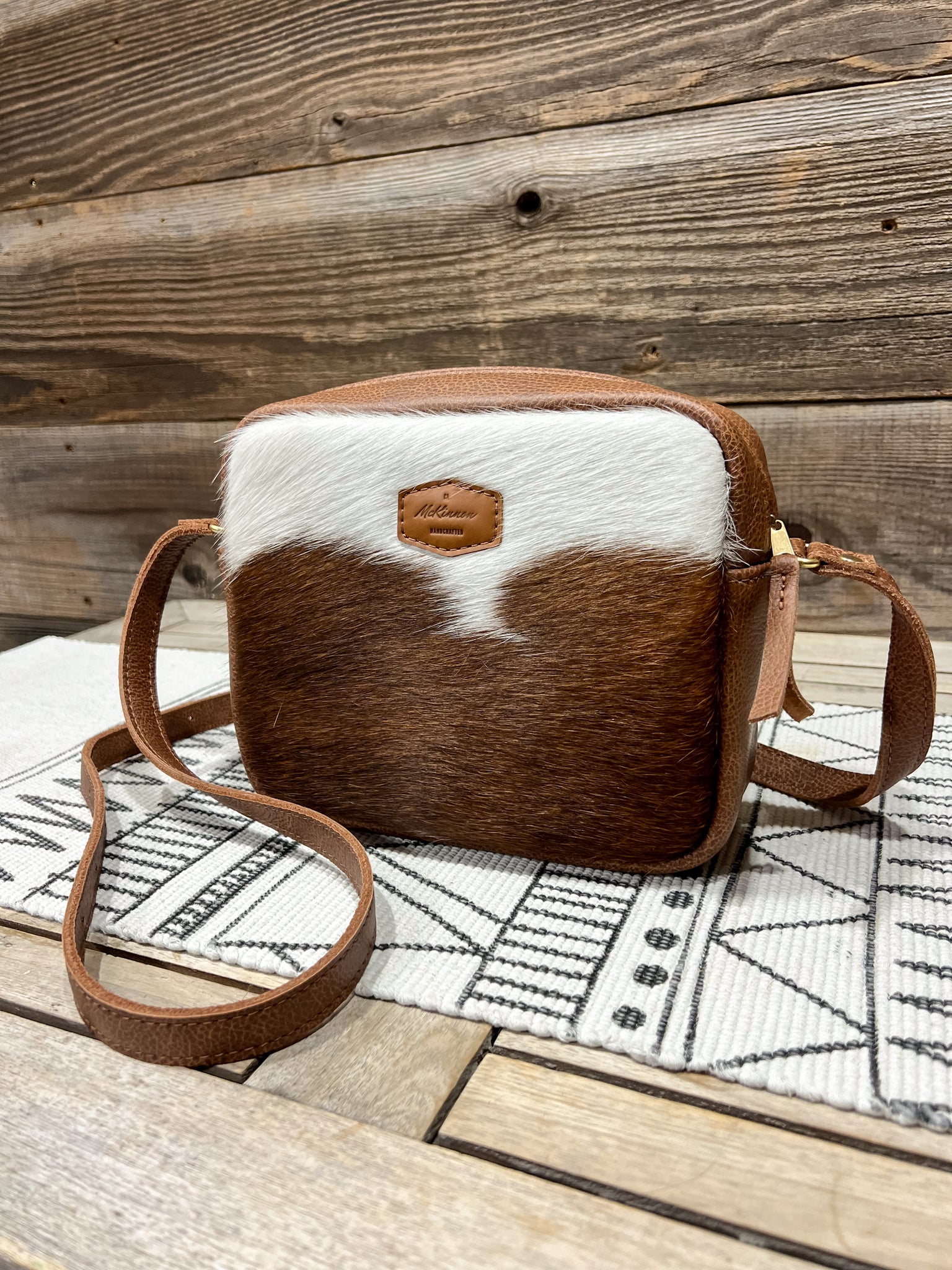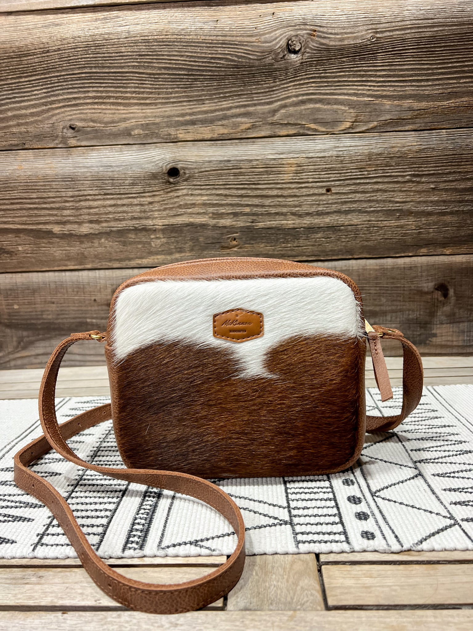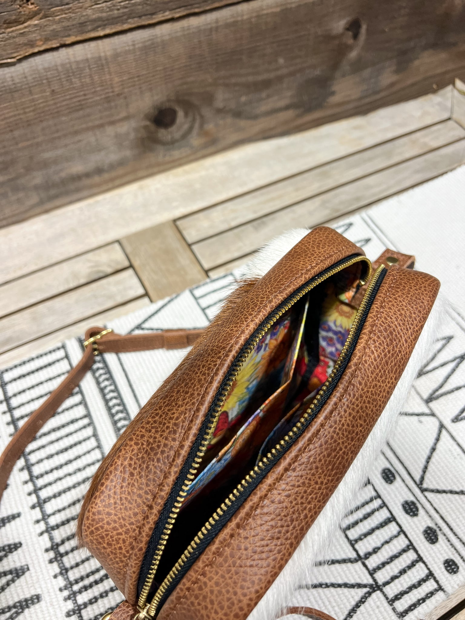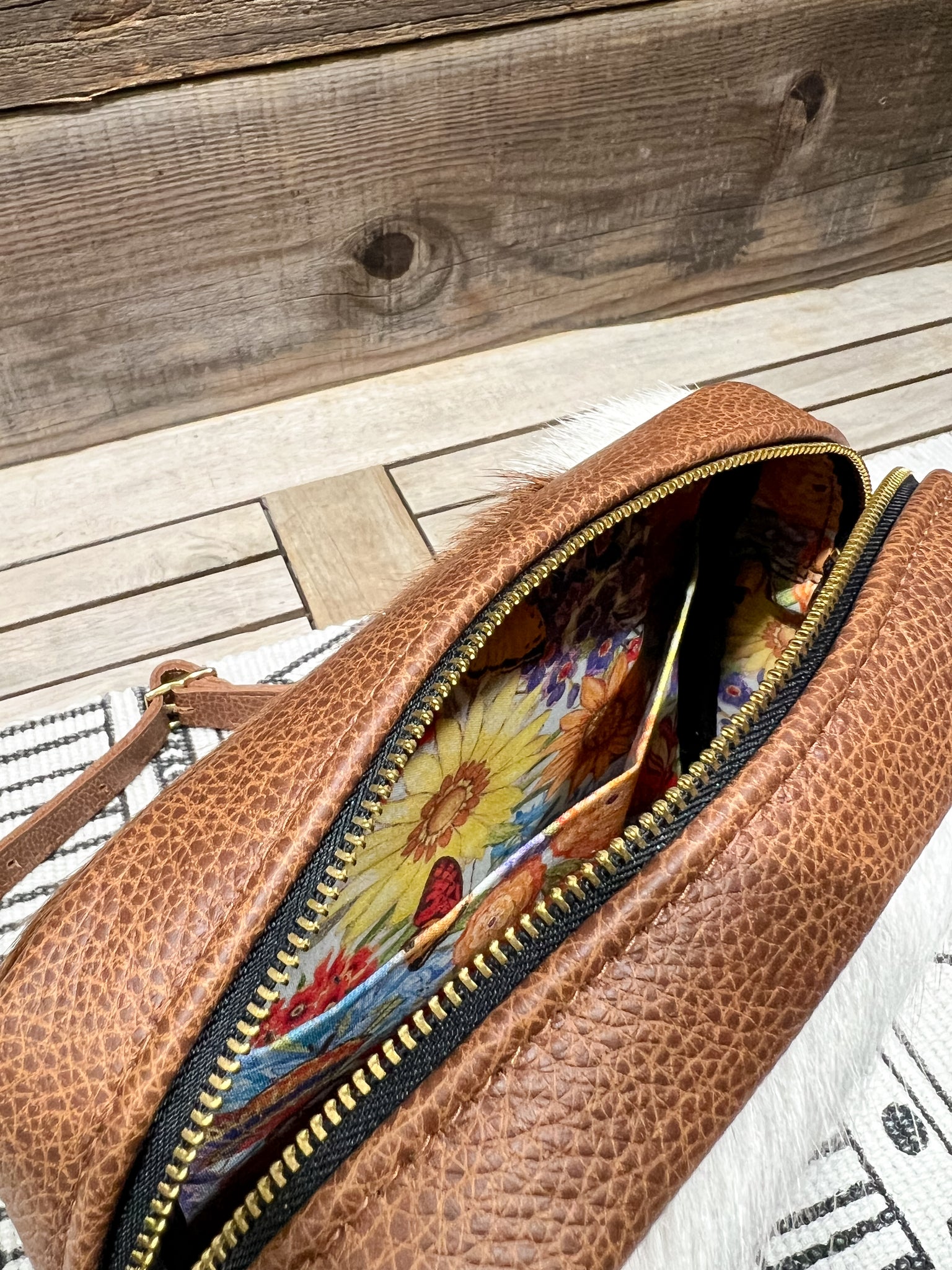 The leather is in our Brown & White Hair on Hide and lined in our Fluttering Butterflies & Floral fabric.